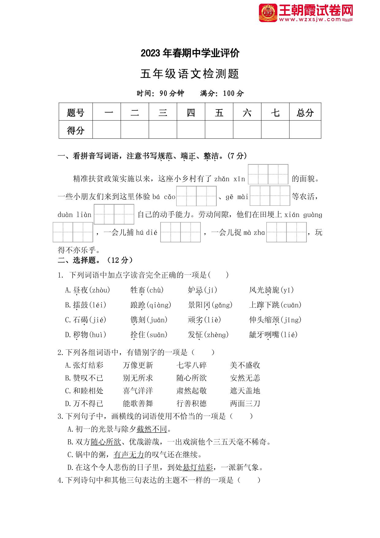 湖北省黄冈市红安县2022-2023学年第二学期期中学业评价试题五年级语文(人教版)