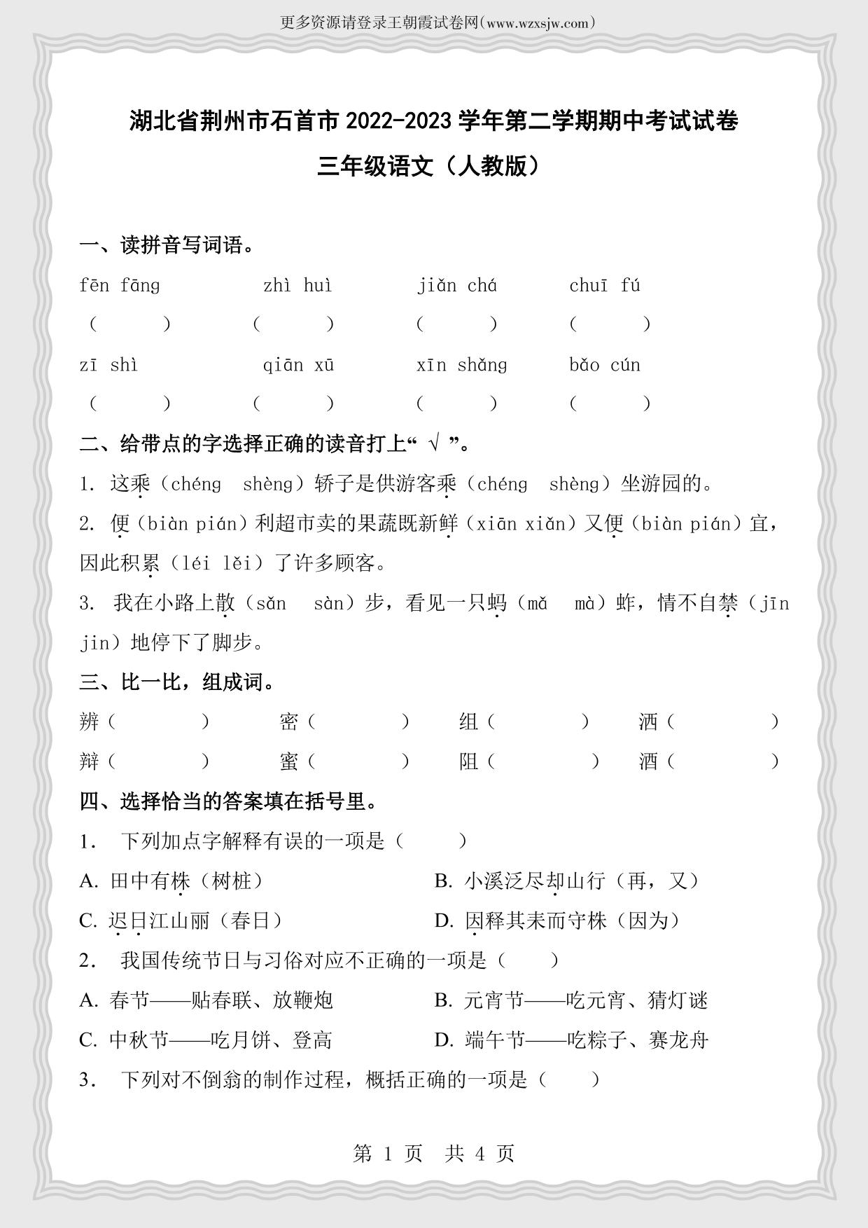 湖北省荆州市石首市2022-2023学年第二学期期中考试试卷三年级语文(人教版)