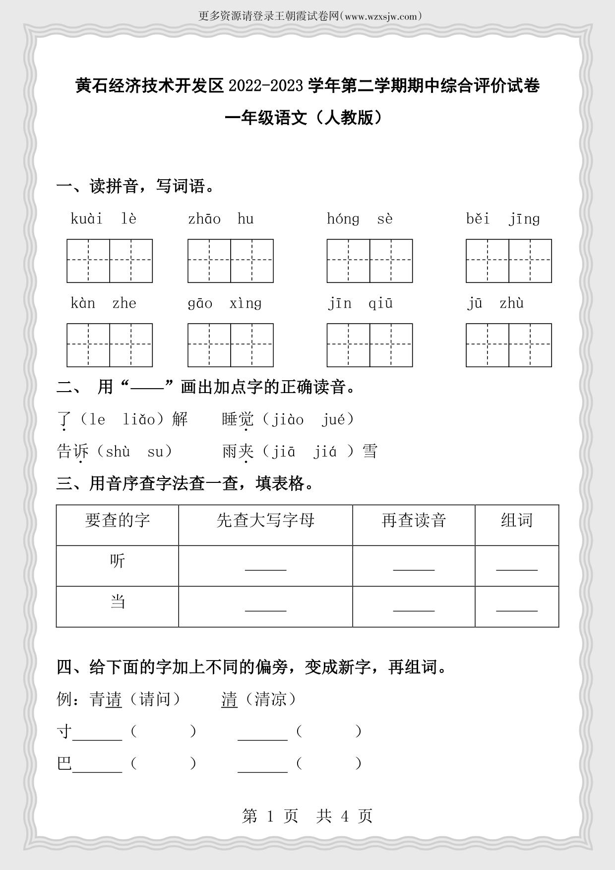 湖北省黄石经济技术开发区2022-2023学年第二学期期中综合评价试卷一年级语文(人教版)