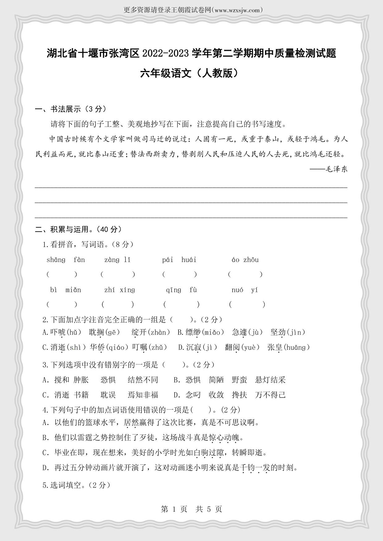 湖北省十堰市张湾区2022-2023学年第二学期期中质量检测试题六年级语文(人教版)