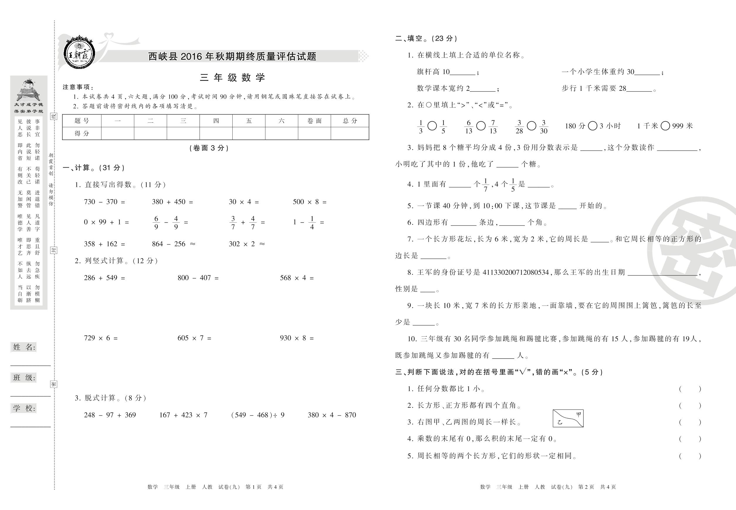 2016-2017学年第一学期南阳市西峡县三年级数学试卷(人教版)【9】