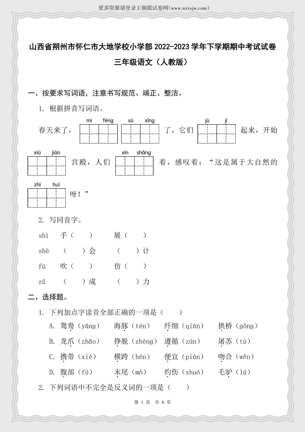 山西省朔州市怀仁市大地学校小学部2022-2023学年下学期期中考试试卷三年级语文(人教版)