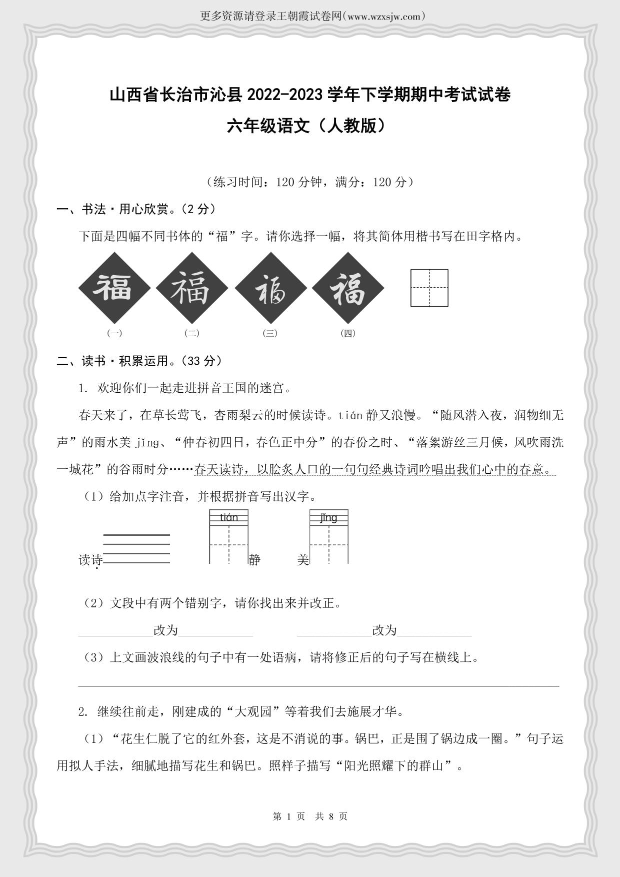 山西省长治市沁县2022-2023学年下学期期中考试试卷六年级语文(人教版)