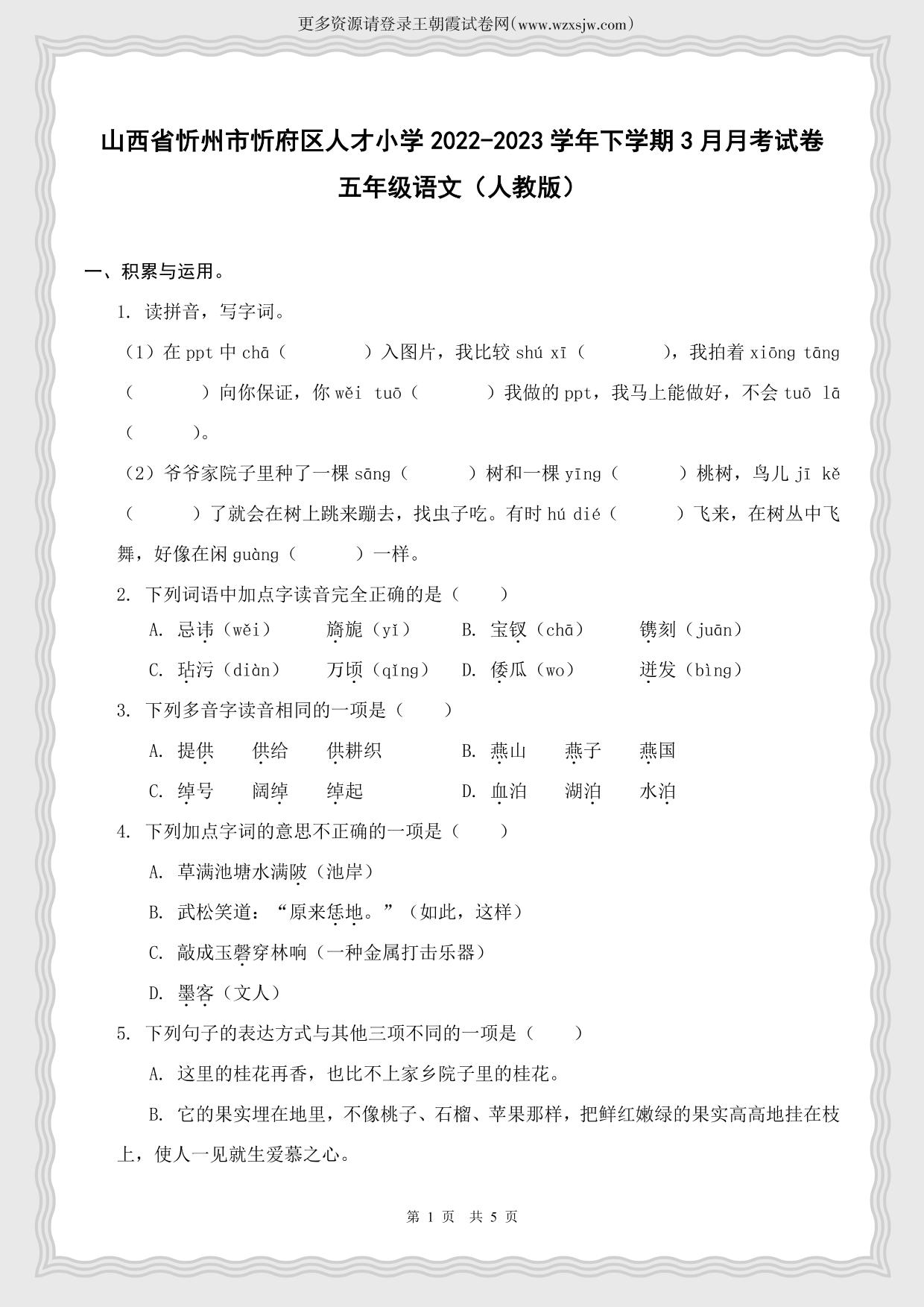 山西省忻州市忻府区人才小学2022-2023学年下学期3月月考试卷五年级语文(人教版)