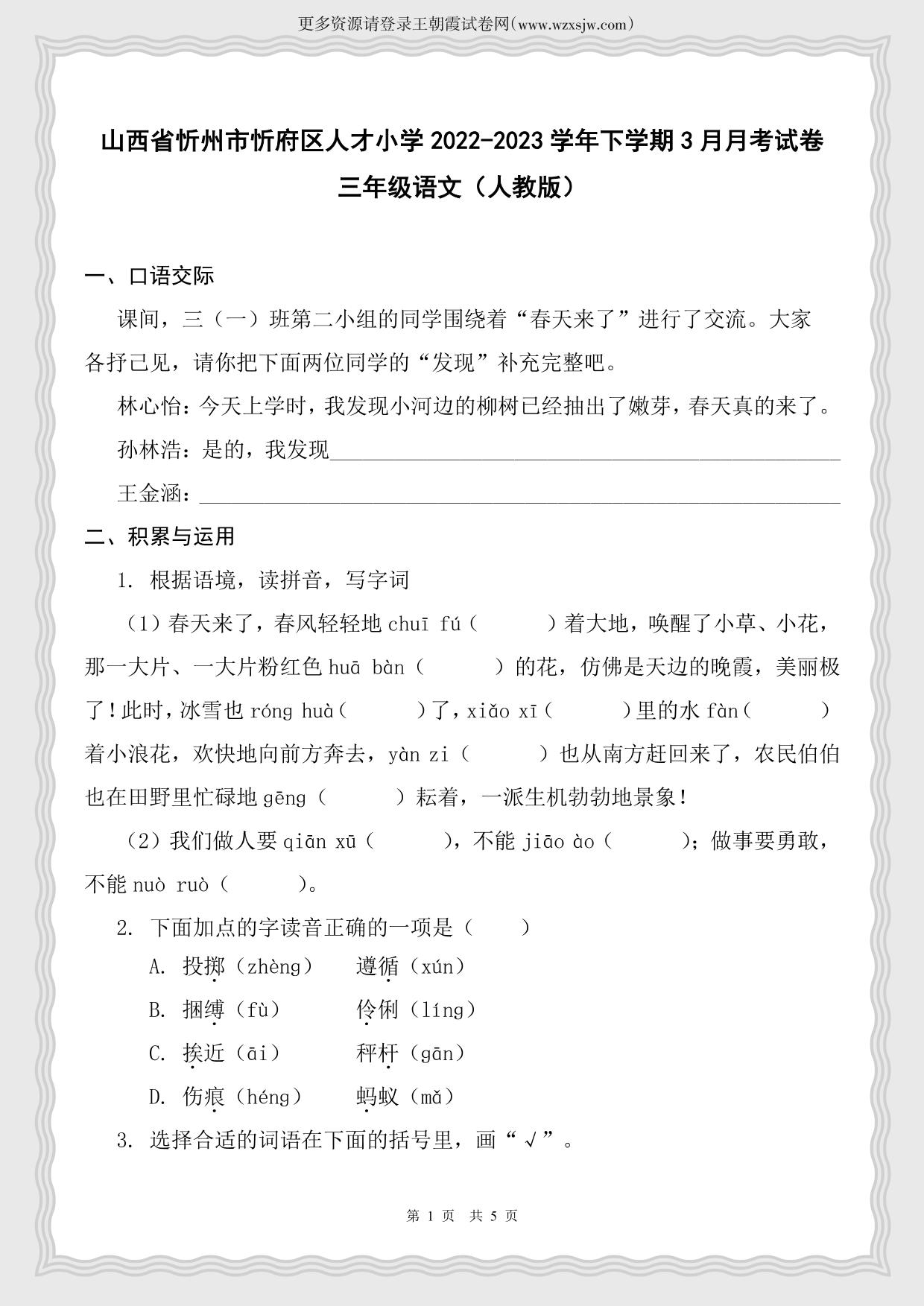 山西省忻州市忻府区人才小学2022-2023学年下学期3月月考试卷三年级语文(人教版)