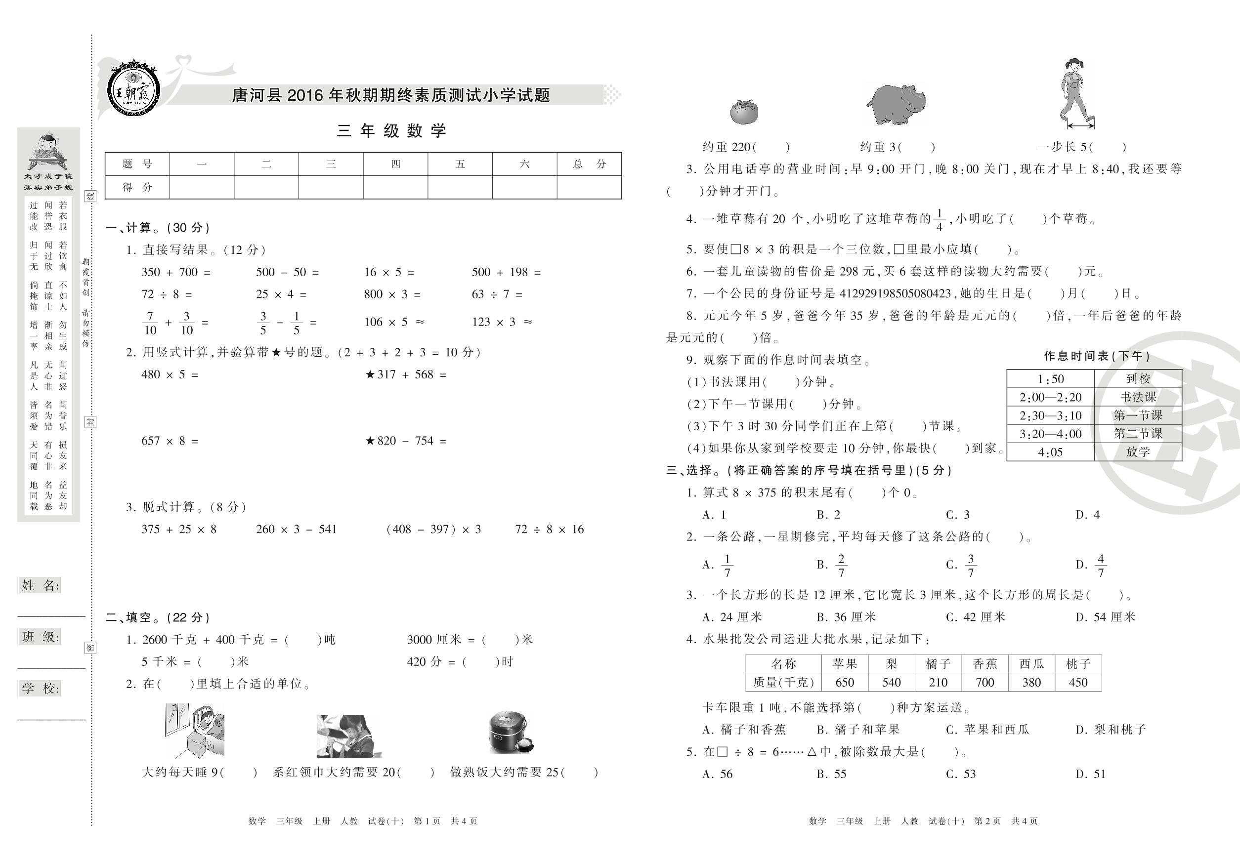 2016-2017学年第一学期南阳市唐河县三年级数学试卷(人教版)【10】