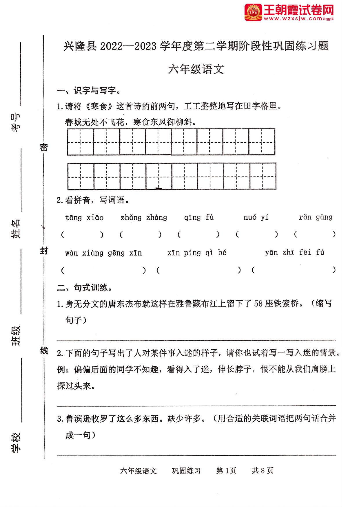 河北省承德市兴隆县2022-2023学年度第二学期阶段性巩固练习期中试卷六年级语文(人教版)