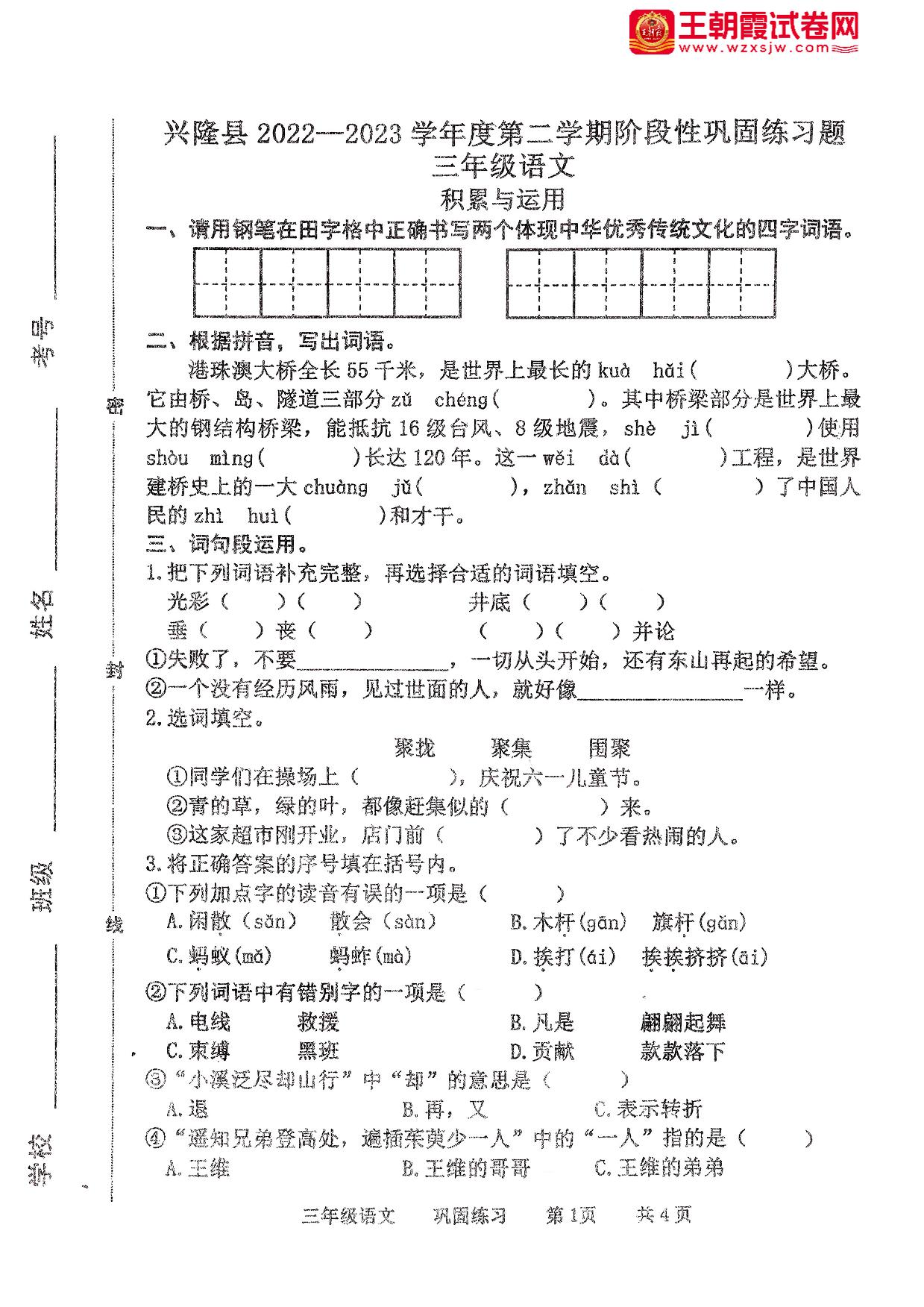 河北省承德市兴隆县2022-2023学年度第二学期阶段性巩固练习期中试卷三年级语文(人教版)
