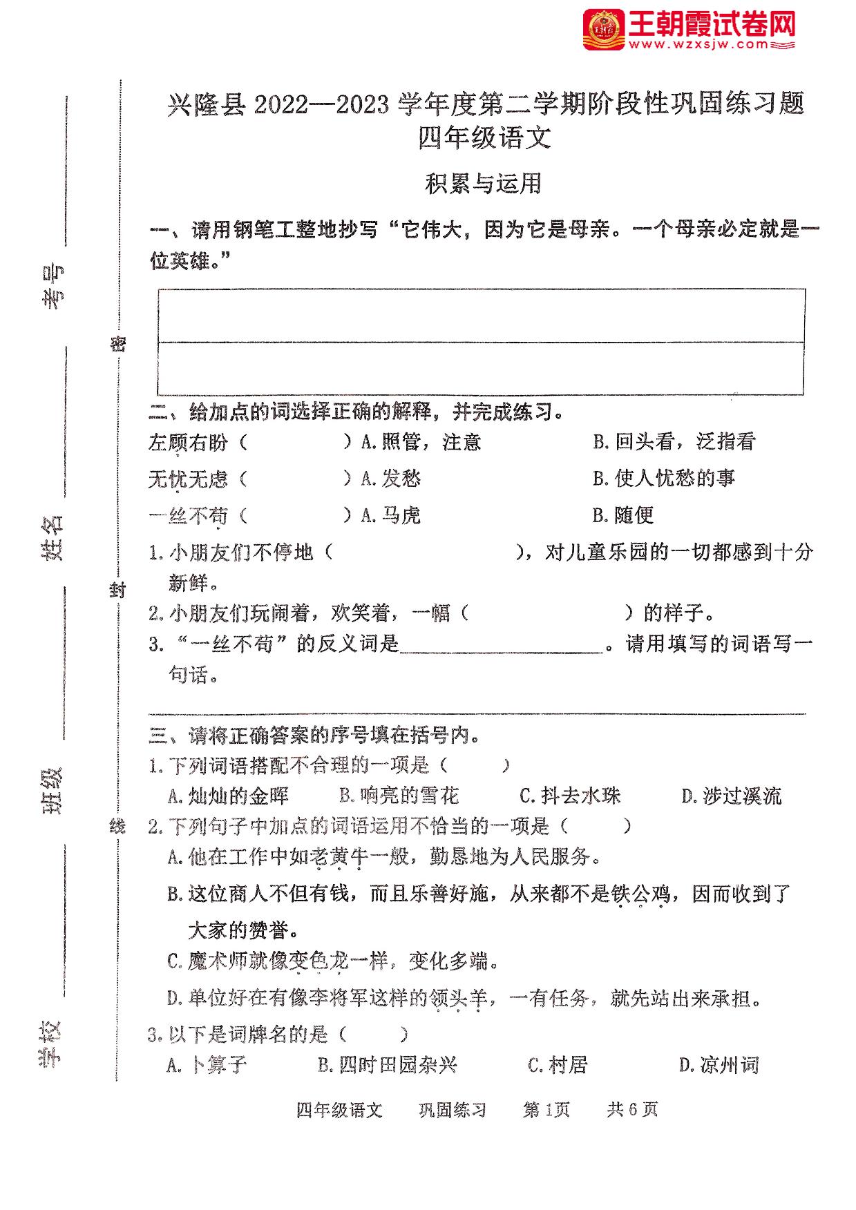 河北省承德市兴隆县2022-2023学年度第二学期阶段性巩固练习期中试卷四年级语文(人教版)