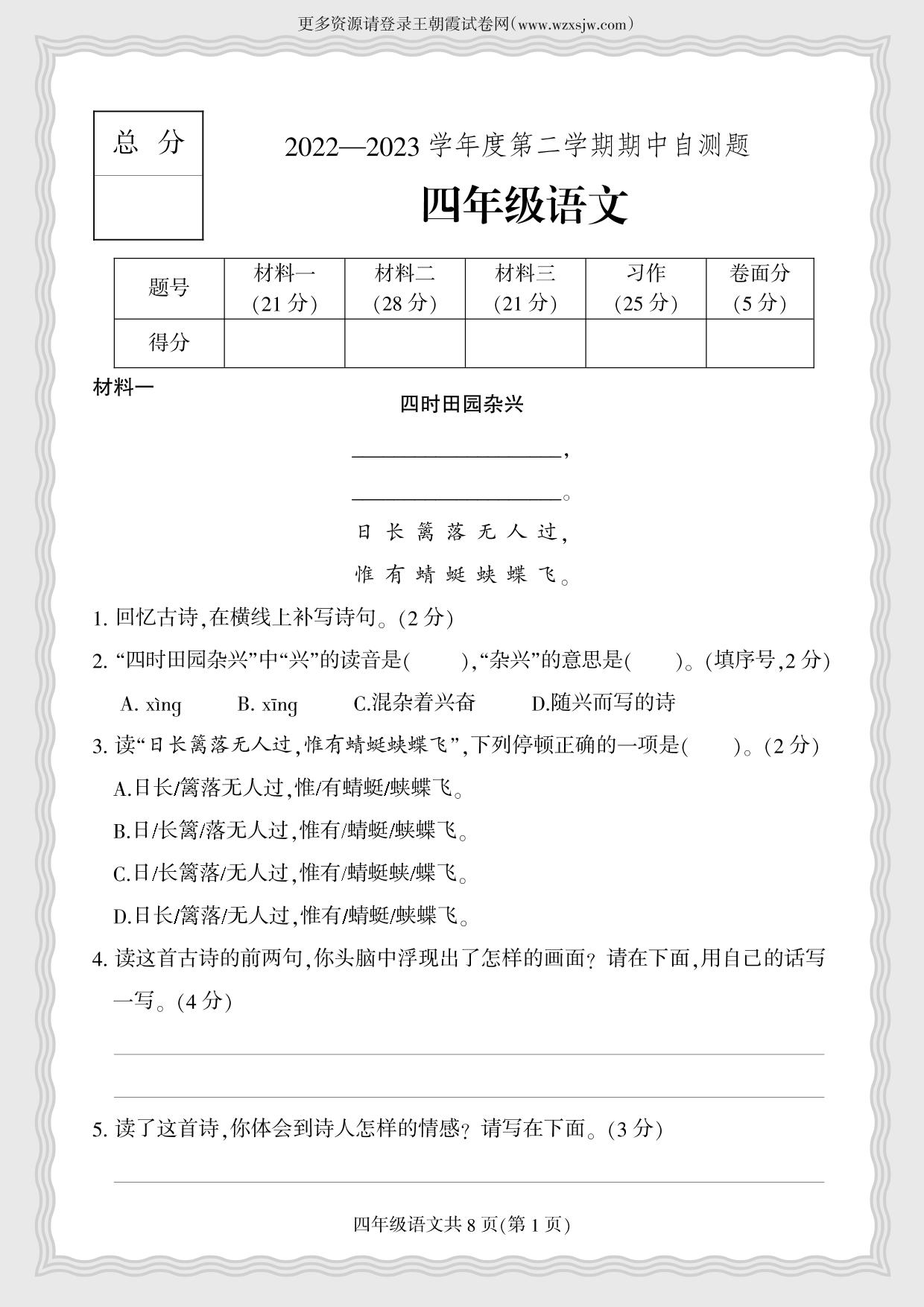 四年级语文人教版下册期中卷