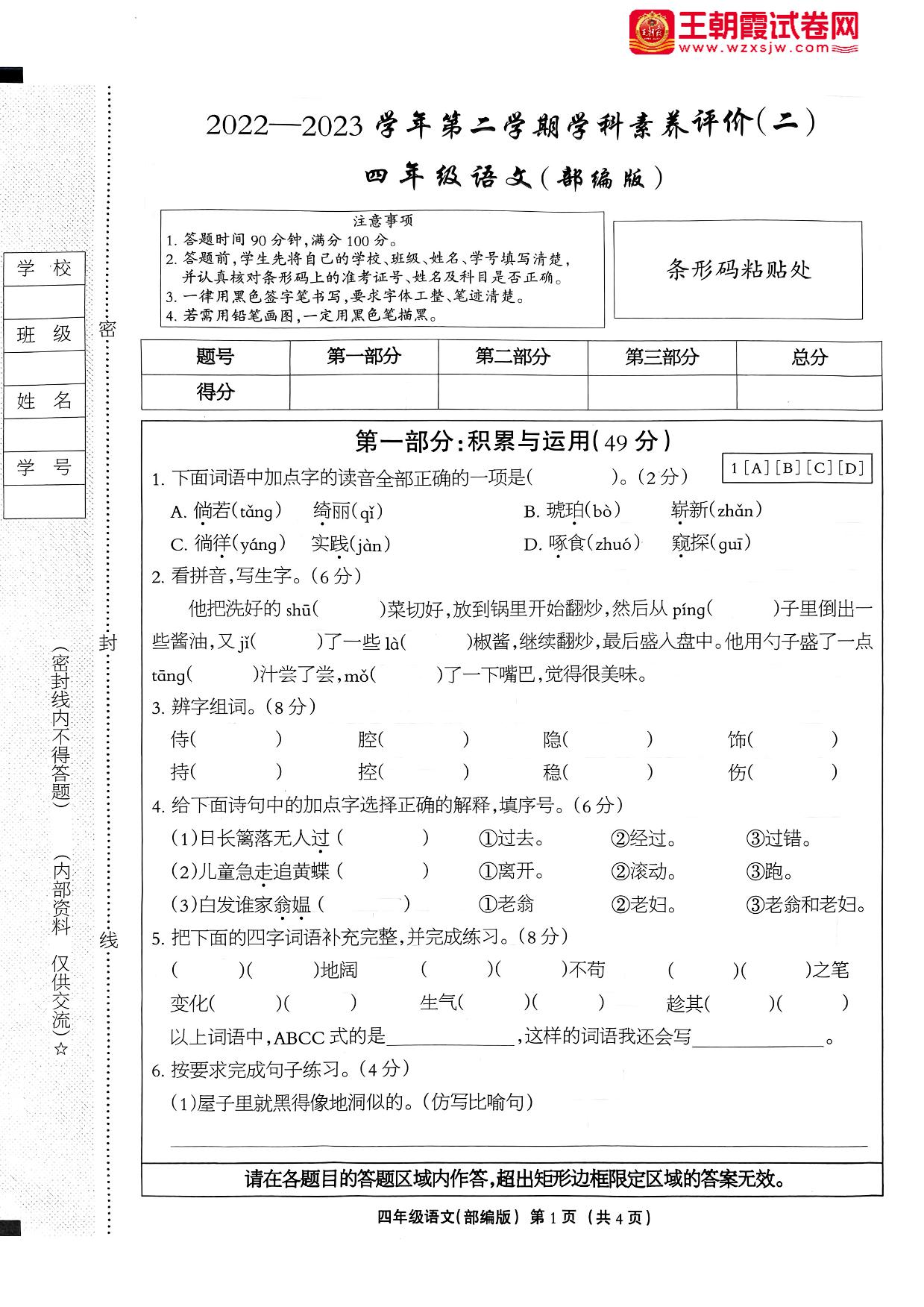 河北省邢台市临城县2022-2023学年第二学期期中学科素养评价四年级语文(人教版)