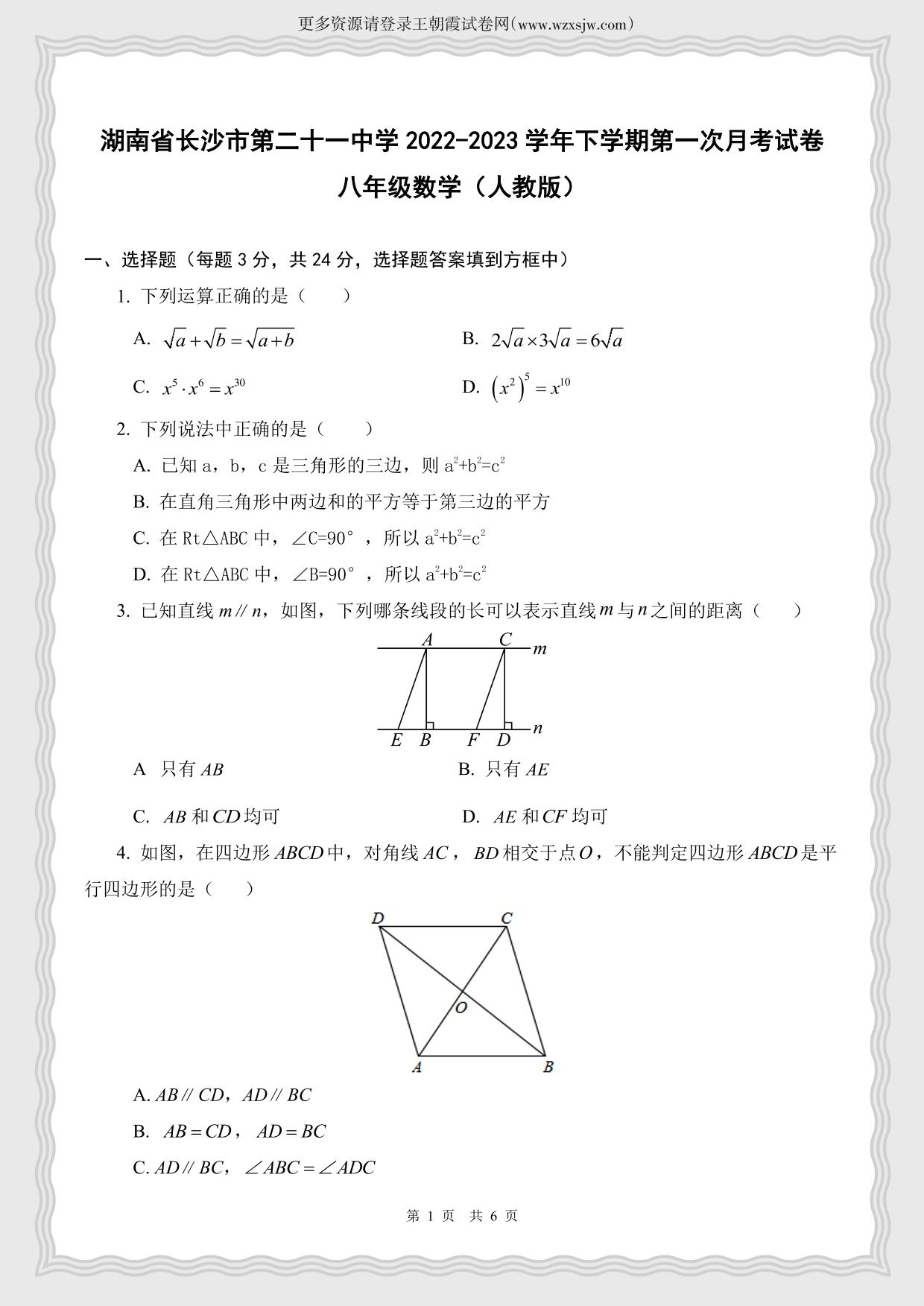 湖南省长沙市第二十一中学2022-2023学年下学期第一次月考试卷八年级数学(人教版)