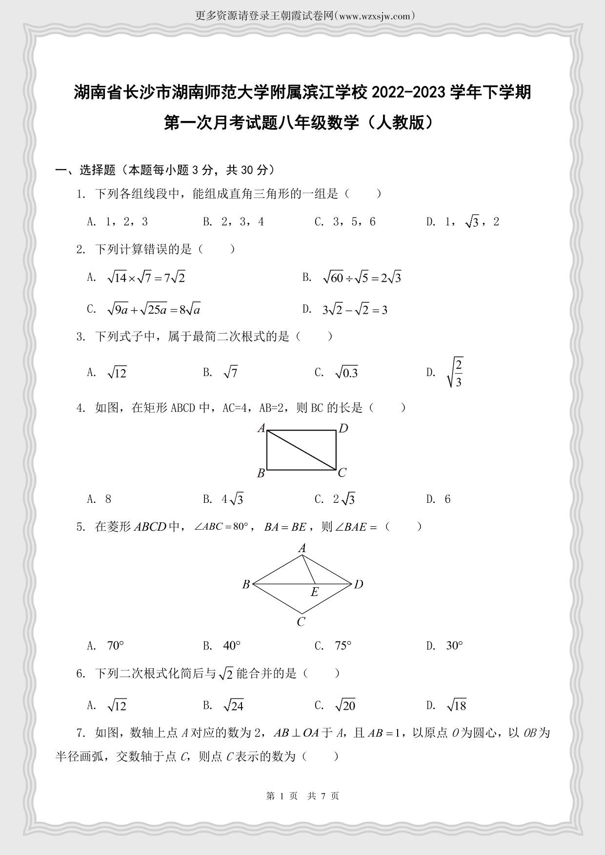 湖南省长沙市湖南师范大学附属滨江学校2022-2023学年下学期第一次月考试题八年级数学(人教版)