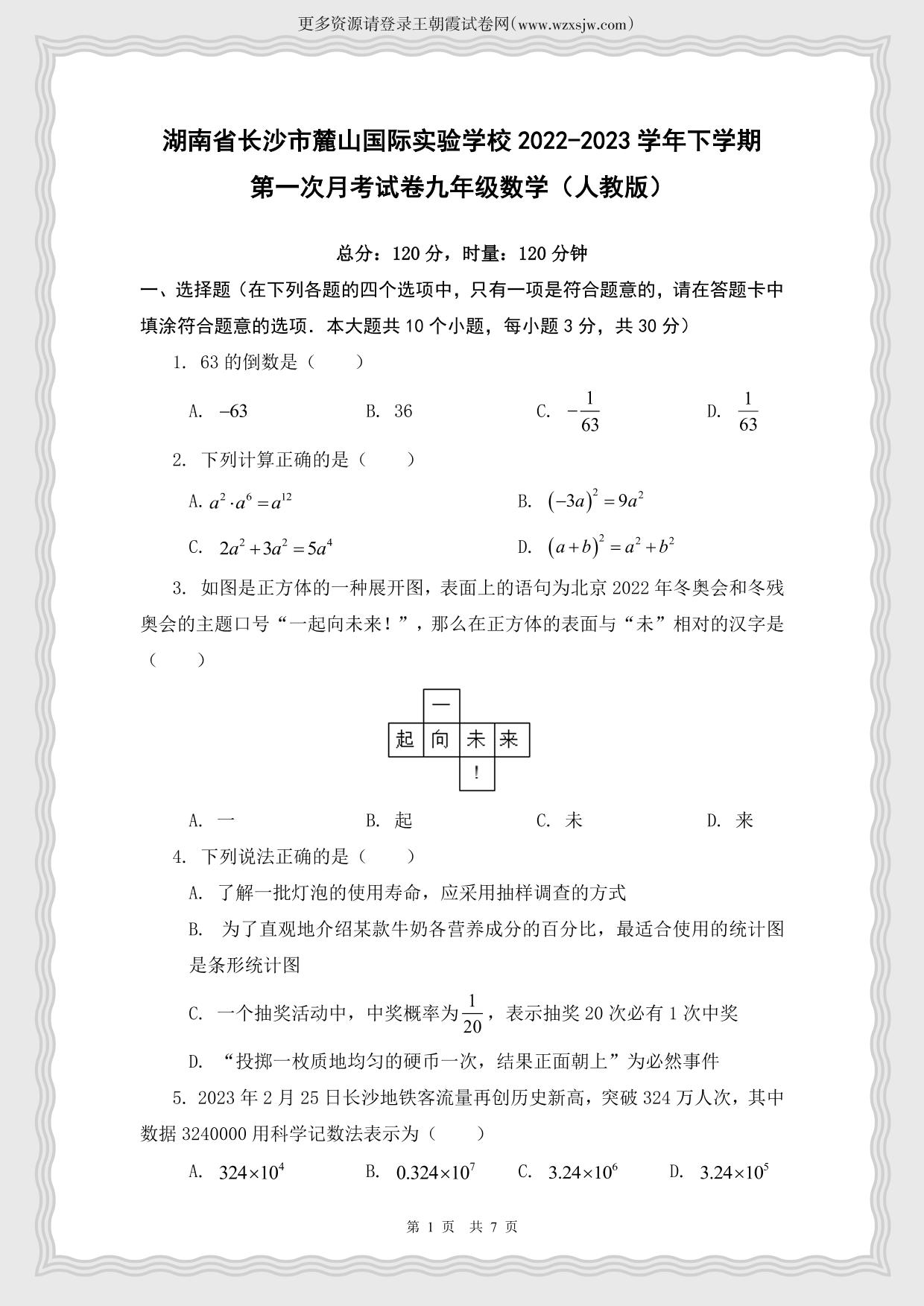 湖南省长沙市麓山国际实验学校2022-2023学年下学期第一次月考试卷九年级数学(人教版)