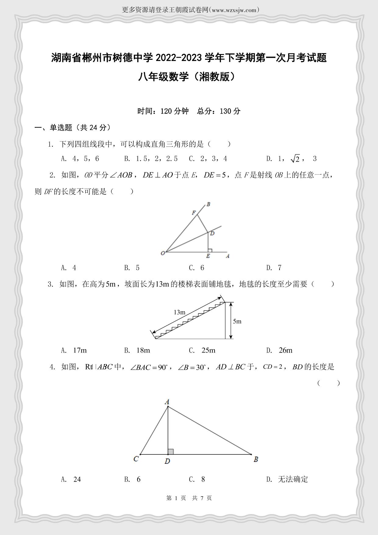 湖南省郴州市树德中学2022-2023学年下学期第一次月考试题八年级数学(湘教版)