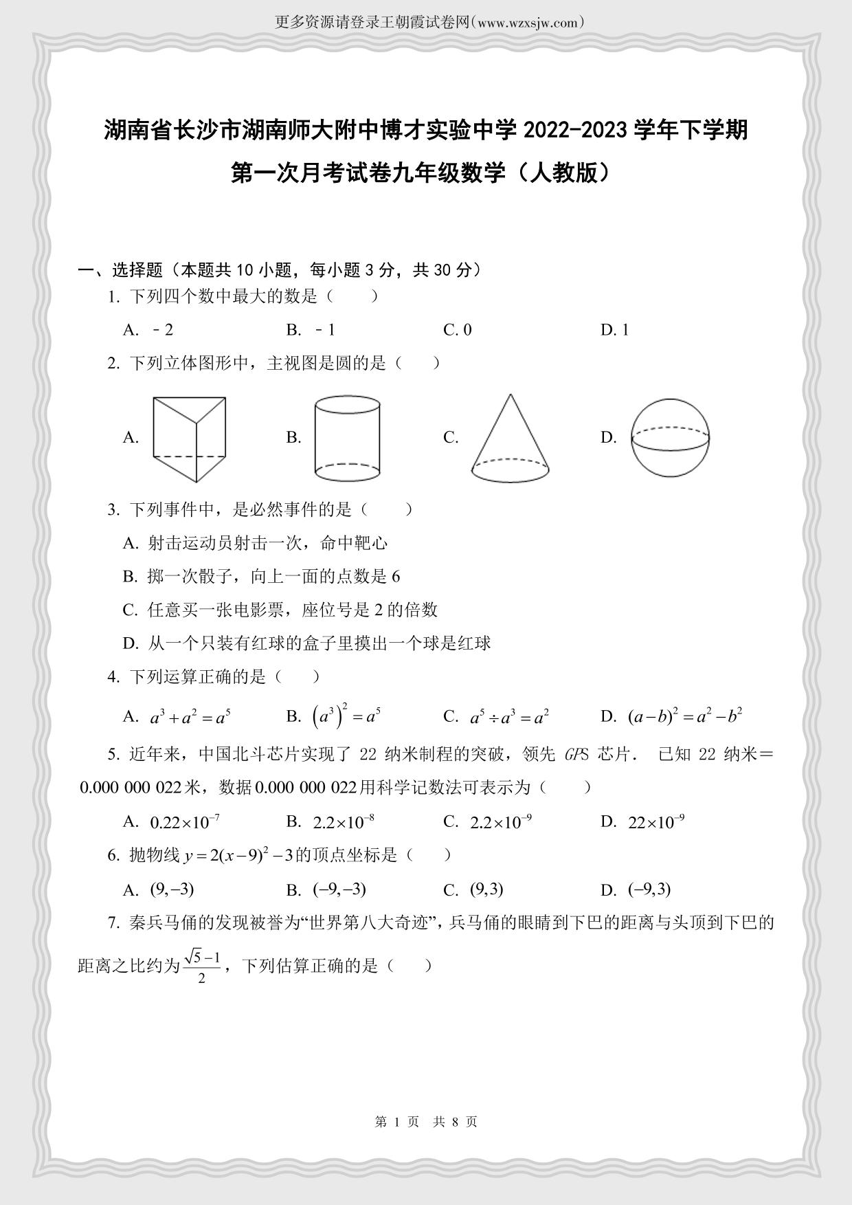 湖南省长沙市湖南师大附中博才实验中学2022-2023学年下学期第一次月考试卷九年级数学(人教版)