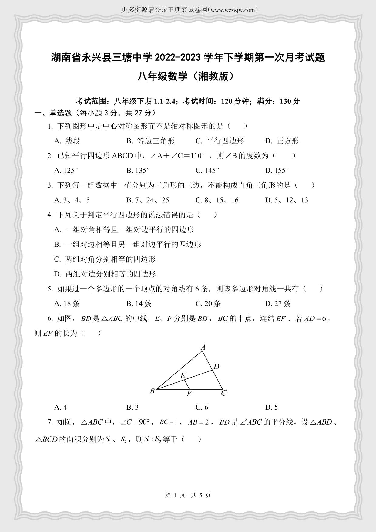湖南省郴州市永兴县三塘中学2022-2023学年下学期第一次月考试题八年级数学(湘教版)