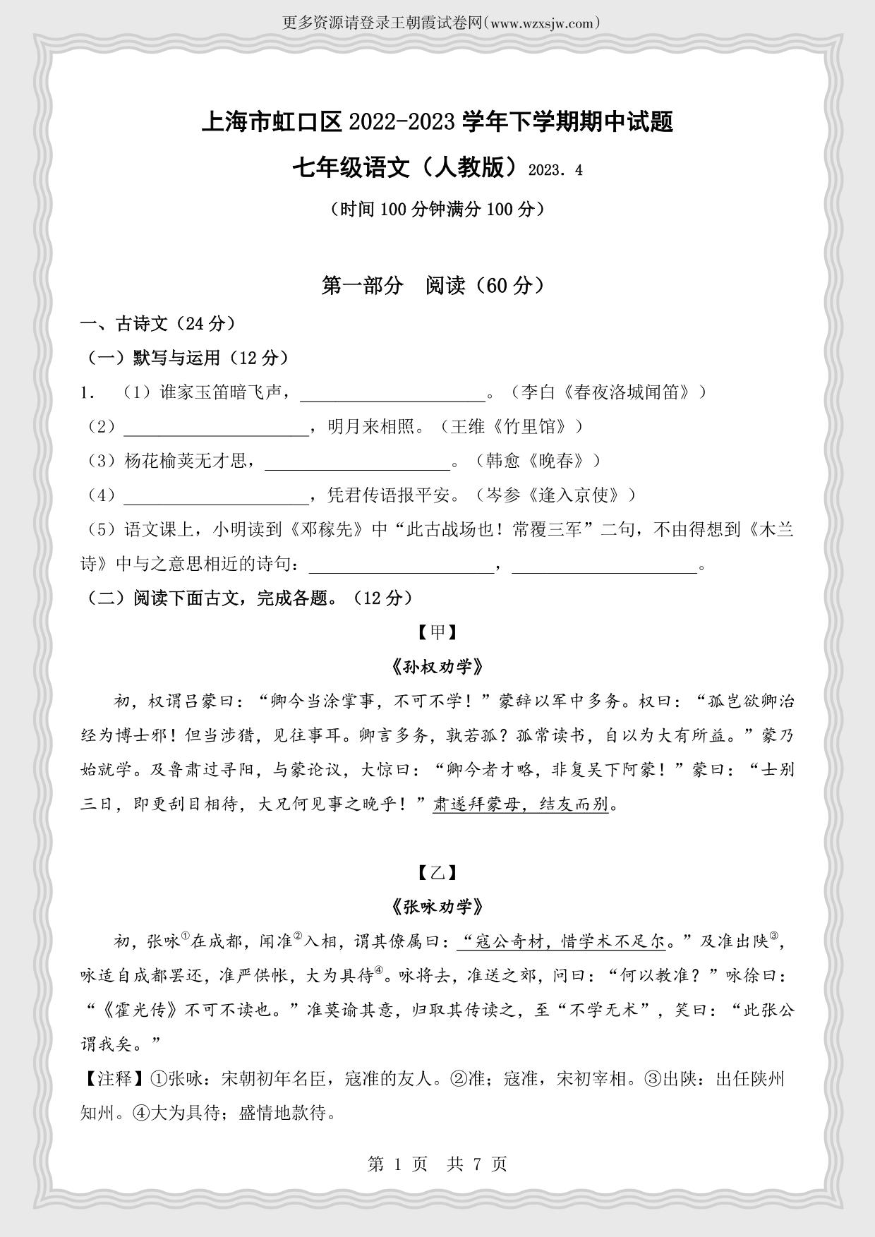 上海市虹口区2022-2023学年下学期期中试题七年级语文(人教版)