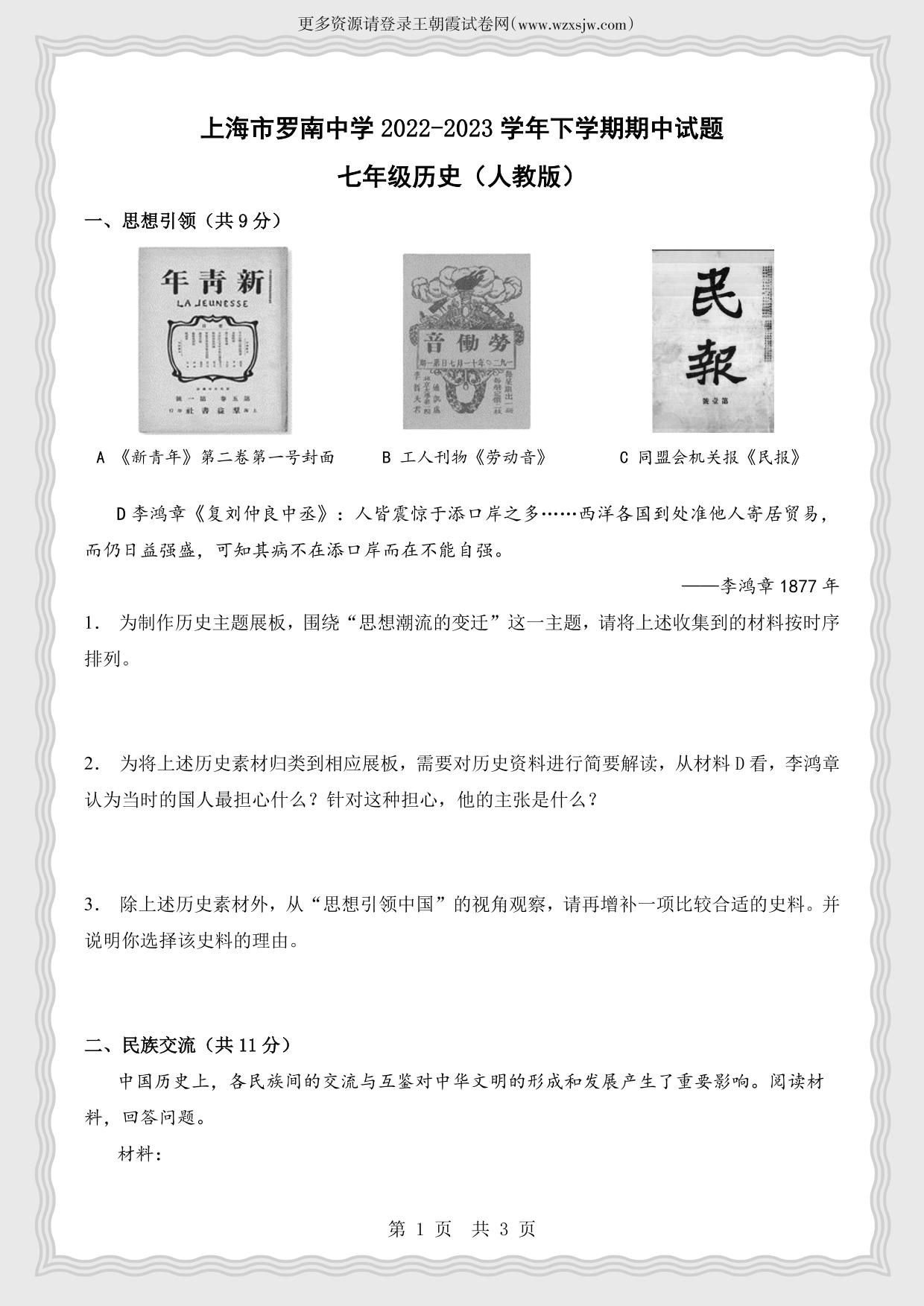 上海市罗南中学2022-2023学年下学期期中试题七年级历史(人教版)