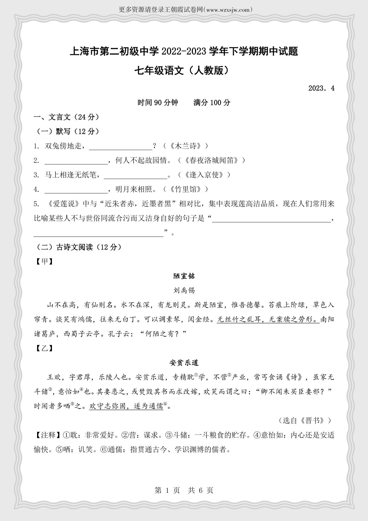 上海市第二初级中学2022-2023学年下学期期中试题七年级语文(人教版)