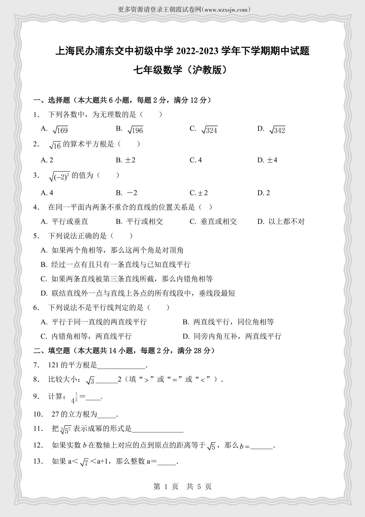 上海民办浦东交中初级中学2022-2023学年下学期期中试题七年级数学(沪教版)