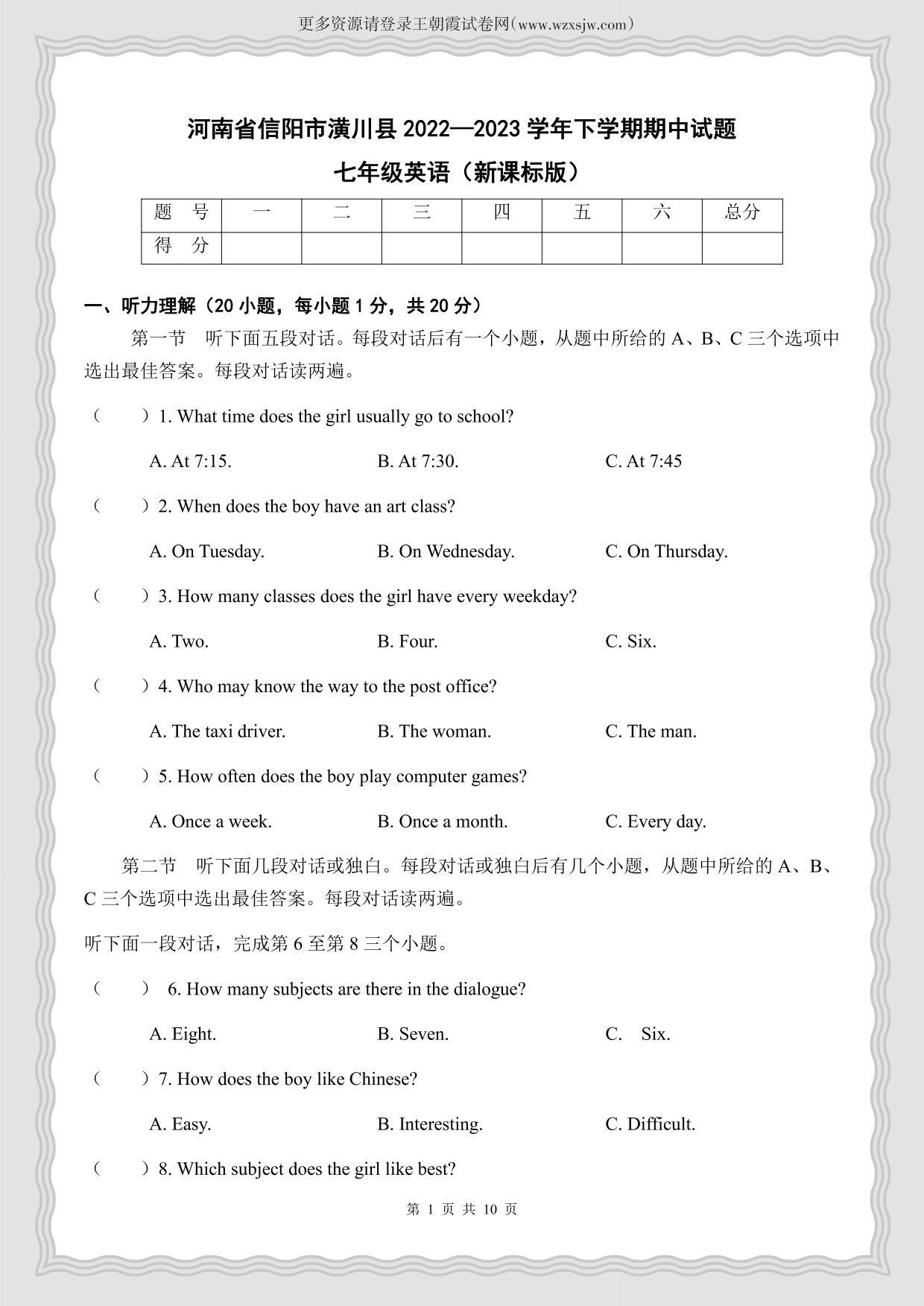 河南省信阳市潢川县2022—2023学年下学期期中试题七年级英语(新课标版)【无听力音频】