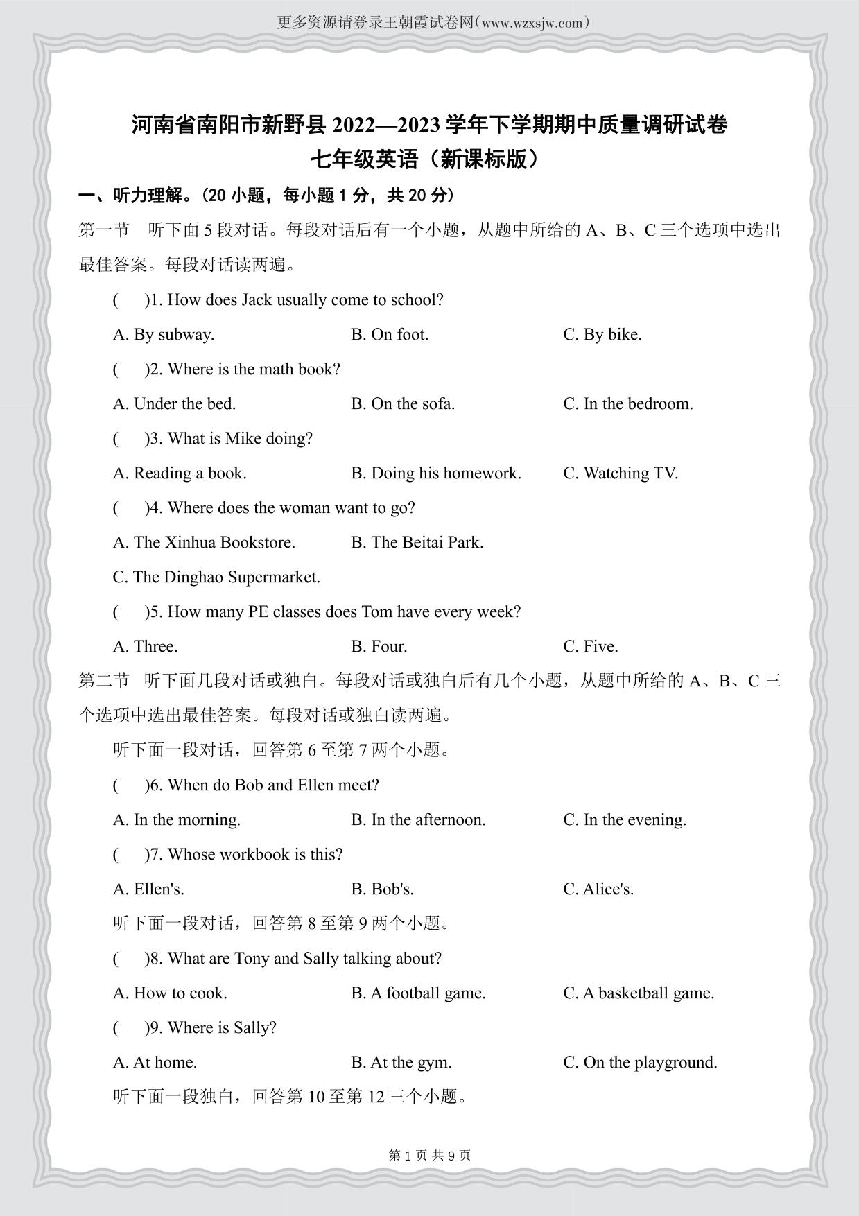河南省南阳市新野县2022—2023学年下学期期中质量调研试卷七年级英语(新课标版)