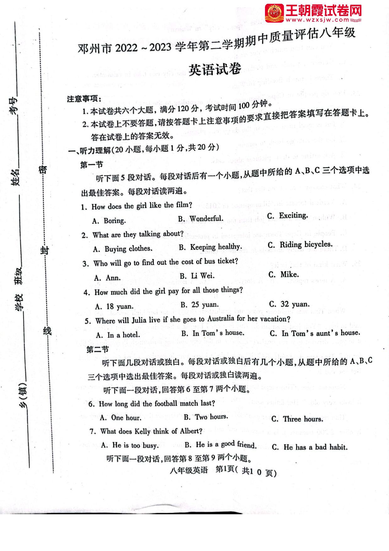 河南省南阳市邓州市2022—2023学年第二学期期中质量评估试卷八年级英语(新课标版)