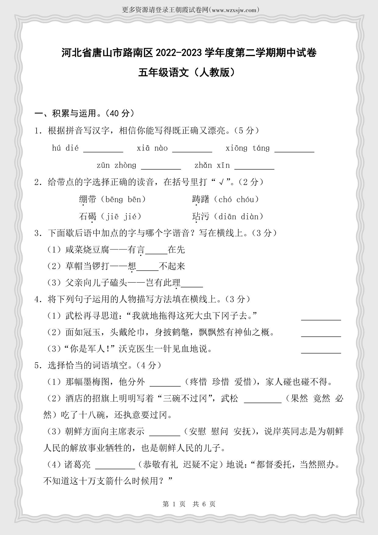 河北省唐山市路南区2022-2023学年度第二学期期中试卷五年级语文(人教版)