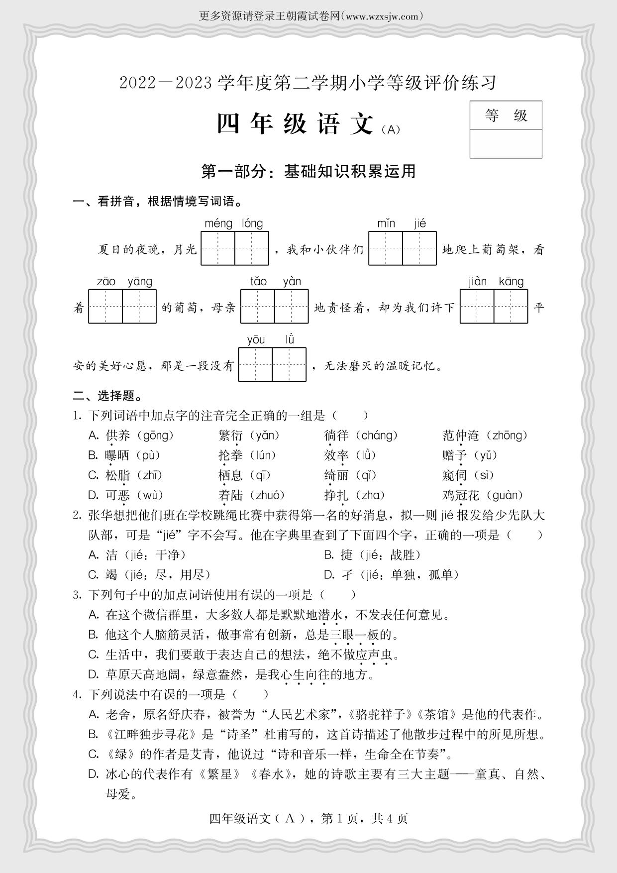 河北省石家庄市高邑县2022-2023学年度第二学期小学等级评价练习期中试卷四年级语文(人教版)