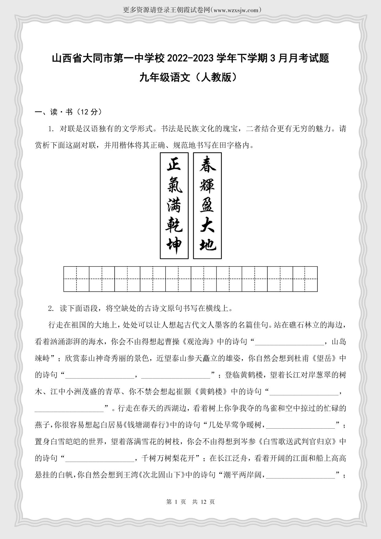 山西省大同市第一中学校2022-2023学年下学期3月月考试题九年级语文(人教版)