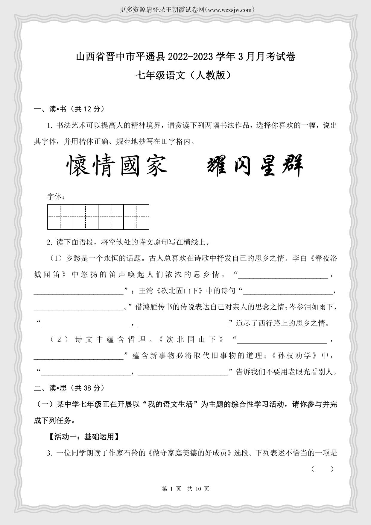 山西省晋中市平遥县2022-2023学年3月月考试卷七年级语文(人教版)