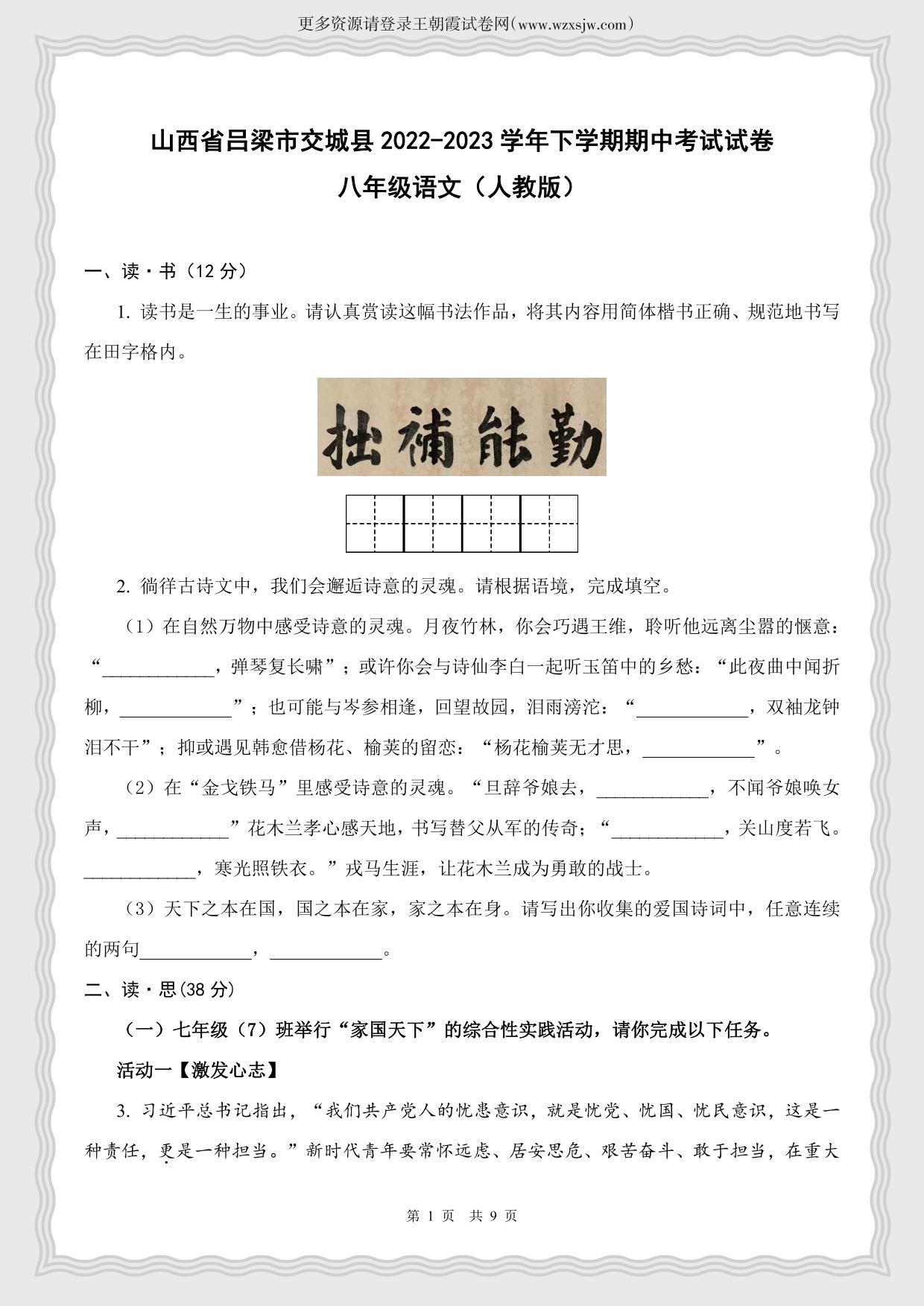 山西省吕梁市交城县2022-2023学年下学期期中考试试卷八年级语文(人教版)