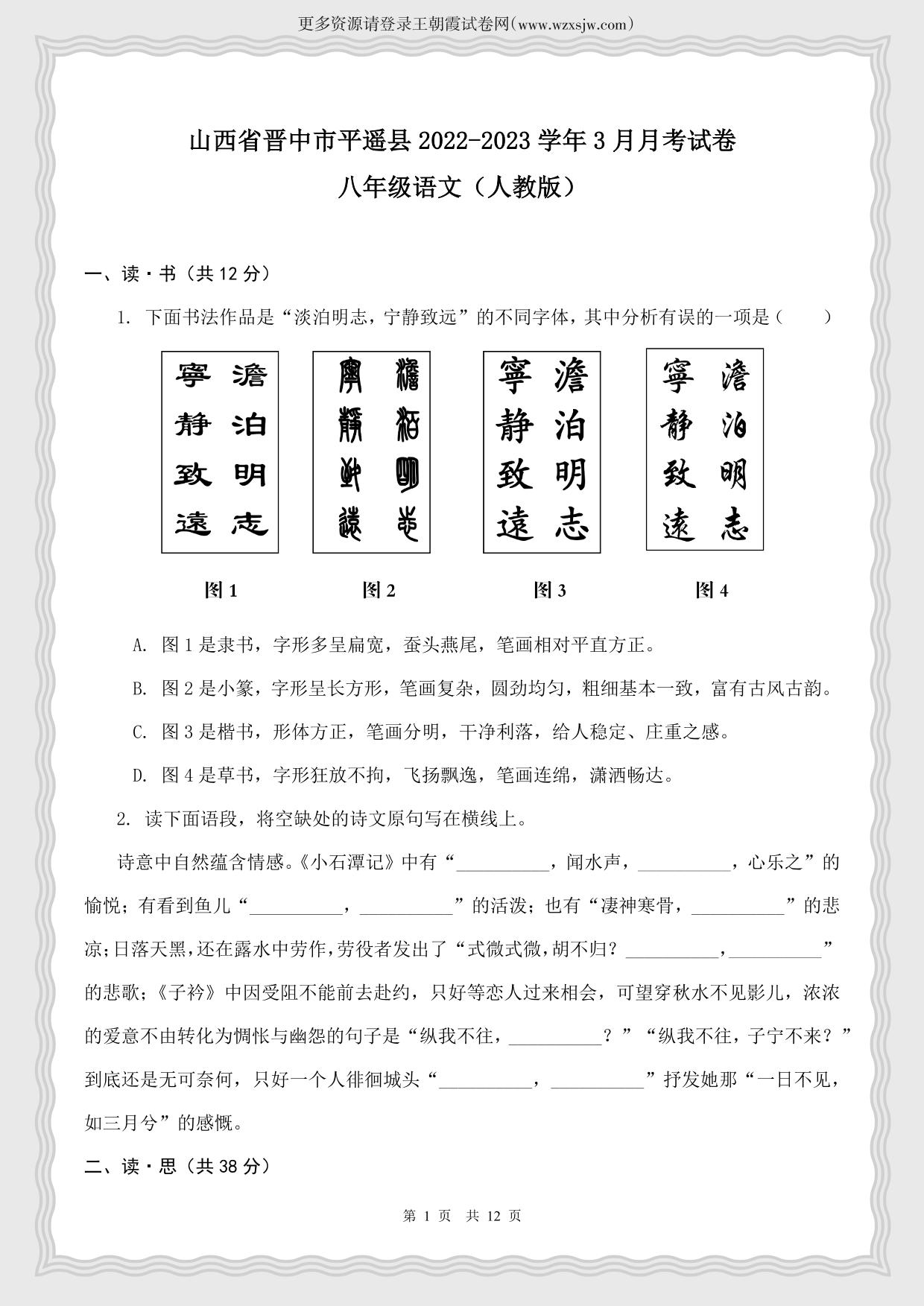 山西省晋中市平遥县2022-2023学年3月月考试卷八年级语文(人教版)