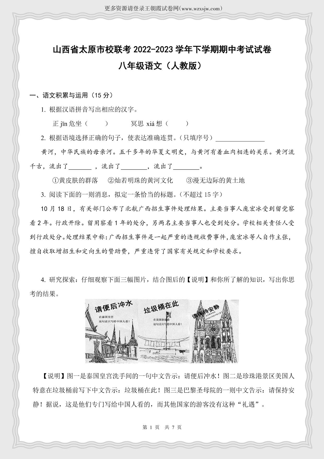 山西省太原市校联考2022-2023学年八年级下学期期中考试试卷语文(人教版)