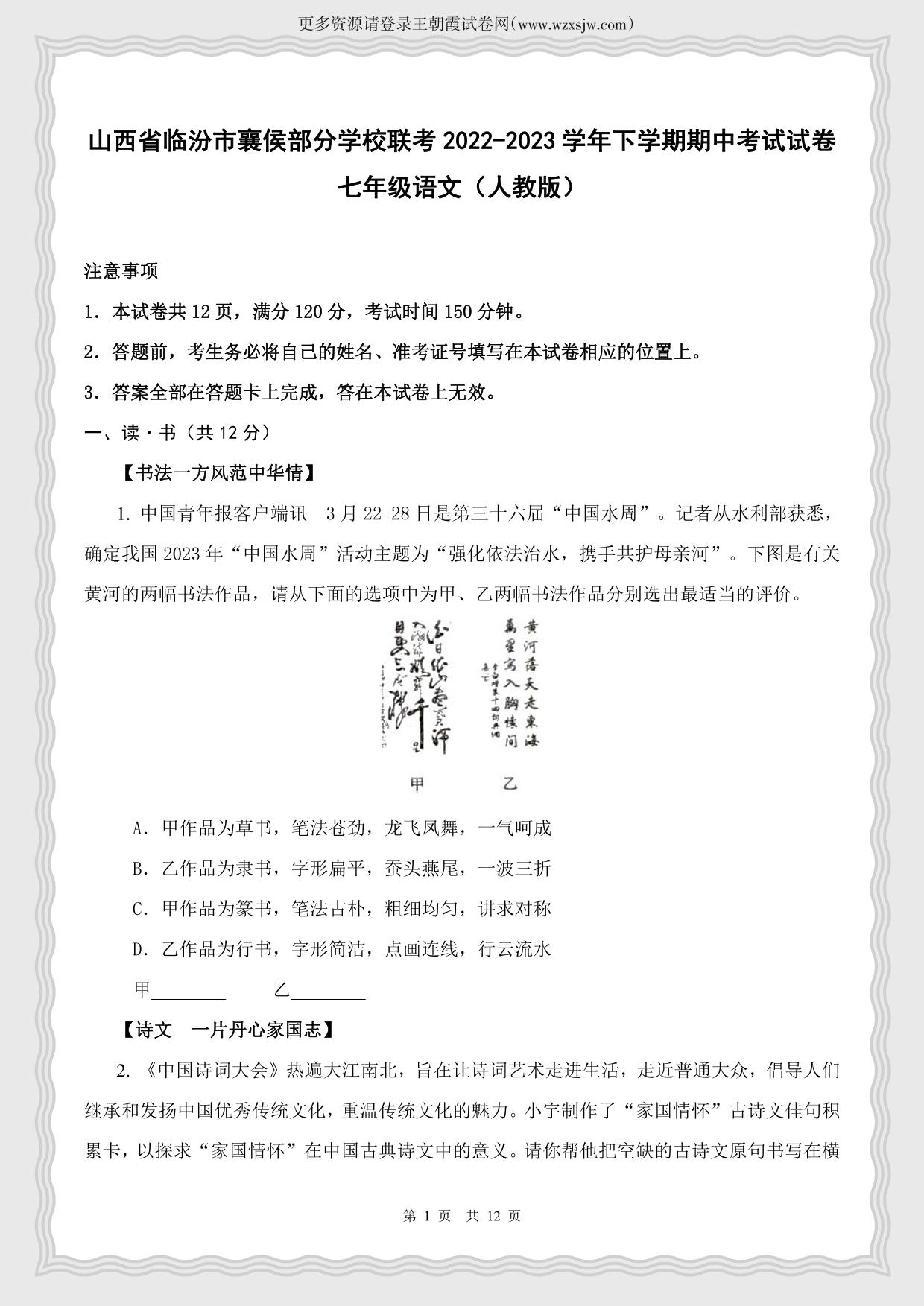 山西省临汾市襄侯部分学校联考2022-2023学年下学期期中考试试卷七年级语文(人教版)