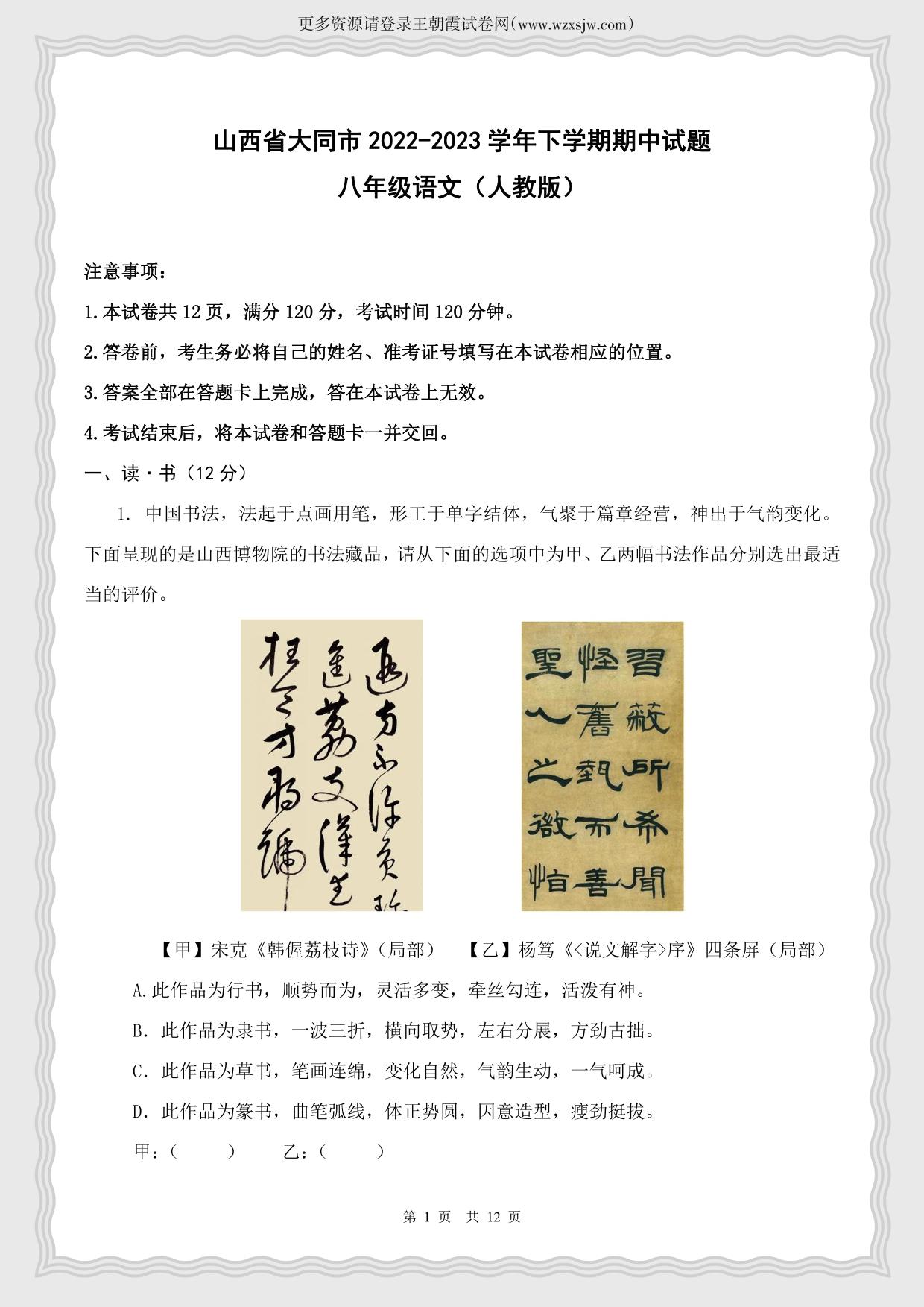 山西省大同市2022-2023学年下学期期中试题八年级语文(人教版)