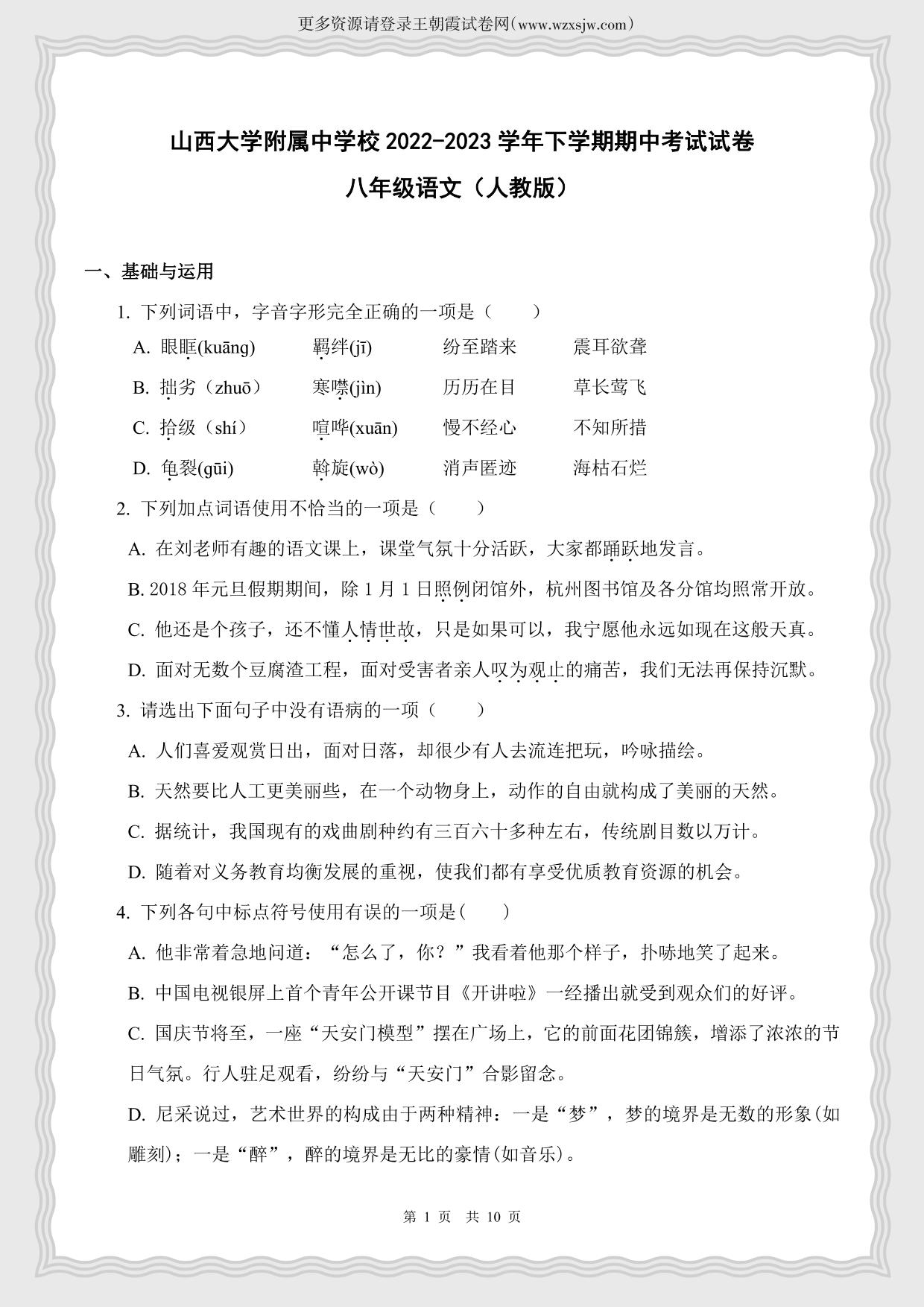 山西大学附属中学校2022-2023学年下学期期中考试试卷八年级语文(人教版)