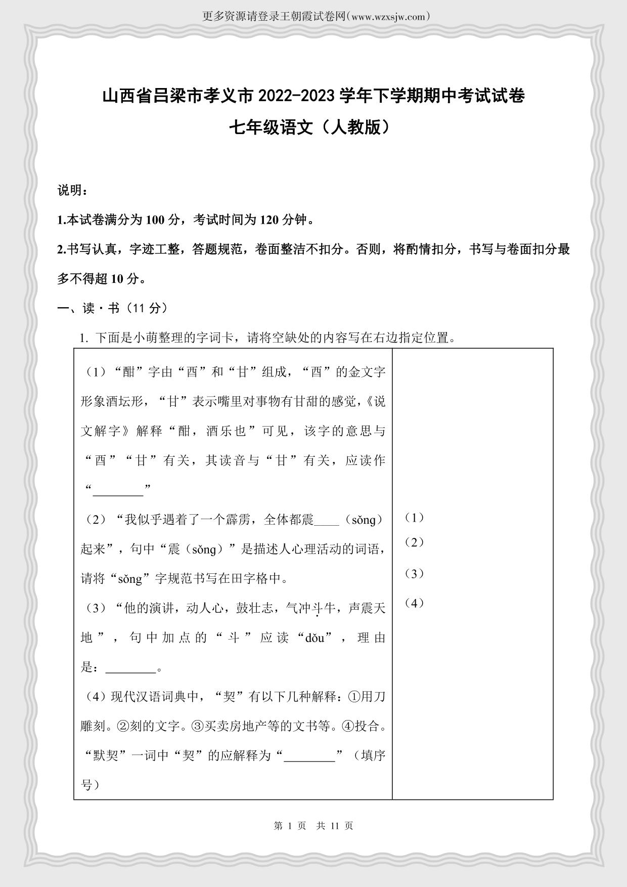 山西省吕梁市孝义市2022-2023学年下学期期中考试试卷七年级语文(人教版)