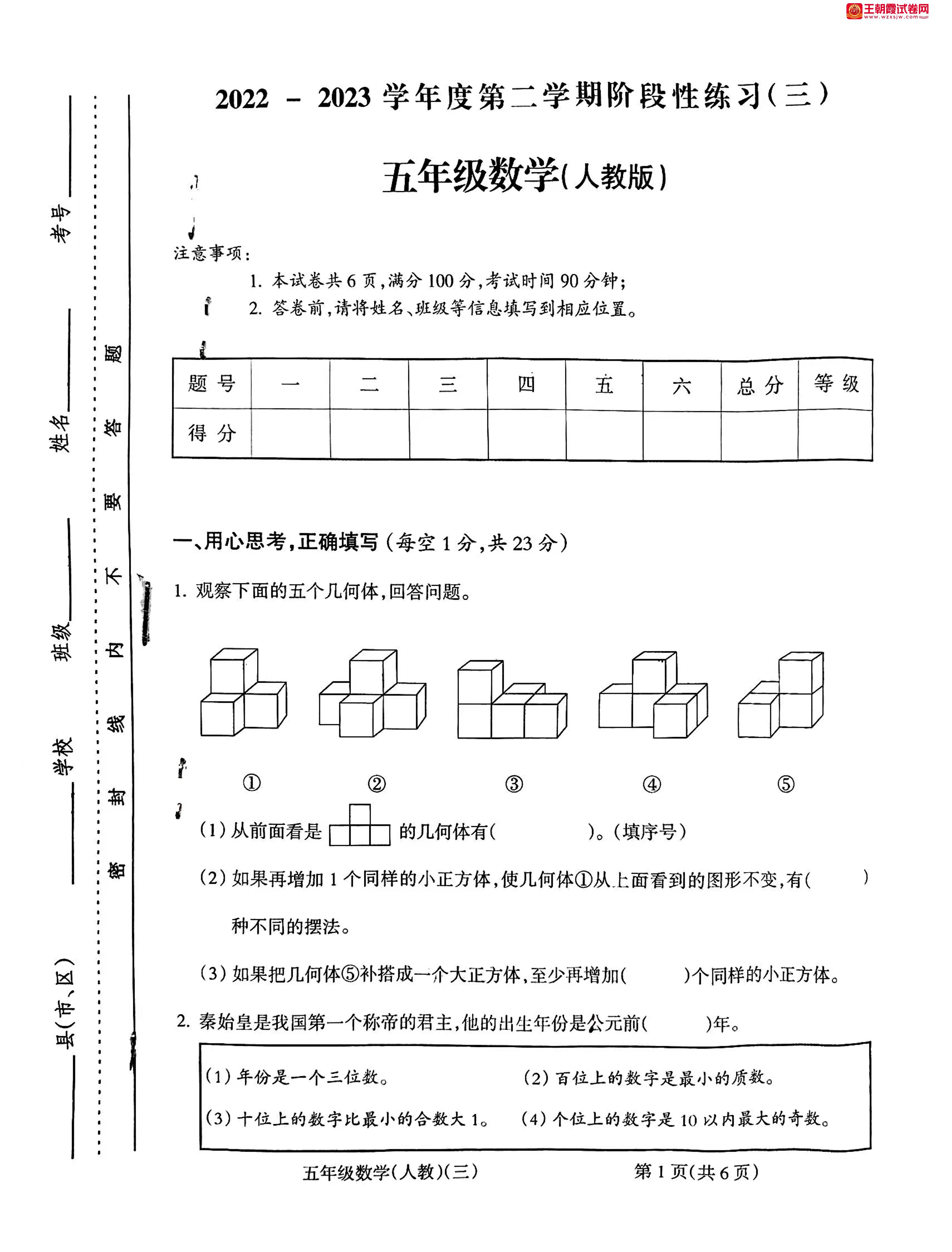 山西省朔州市怀仁市弘博小学2022-2023学年下学期阶段性练习三(月考)五年级数学(人教版)