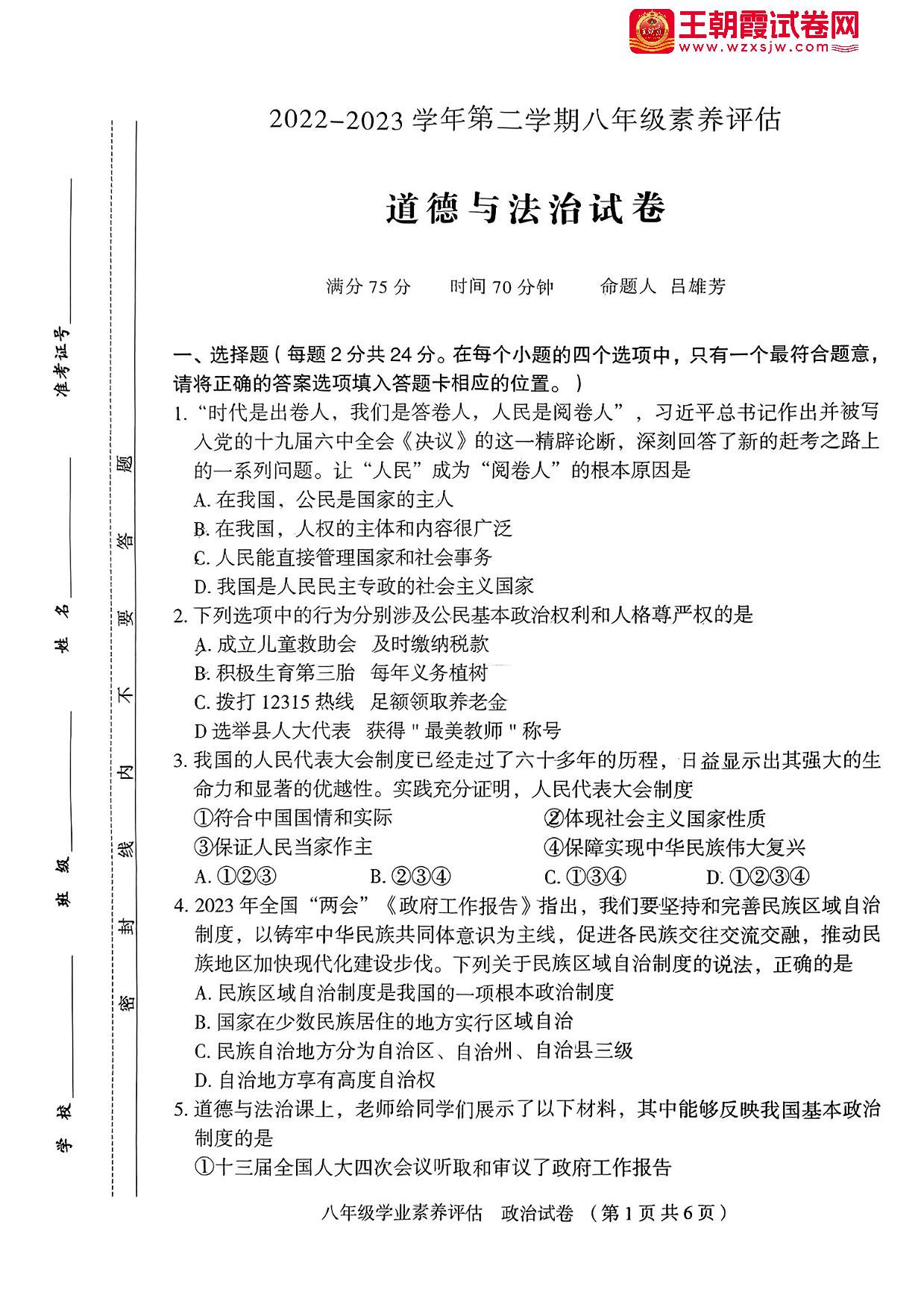八年级道德与法治人教版下册月考卷