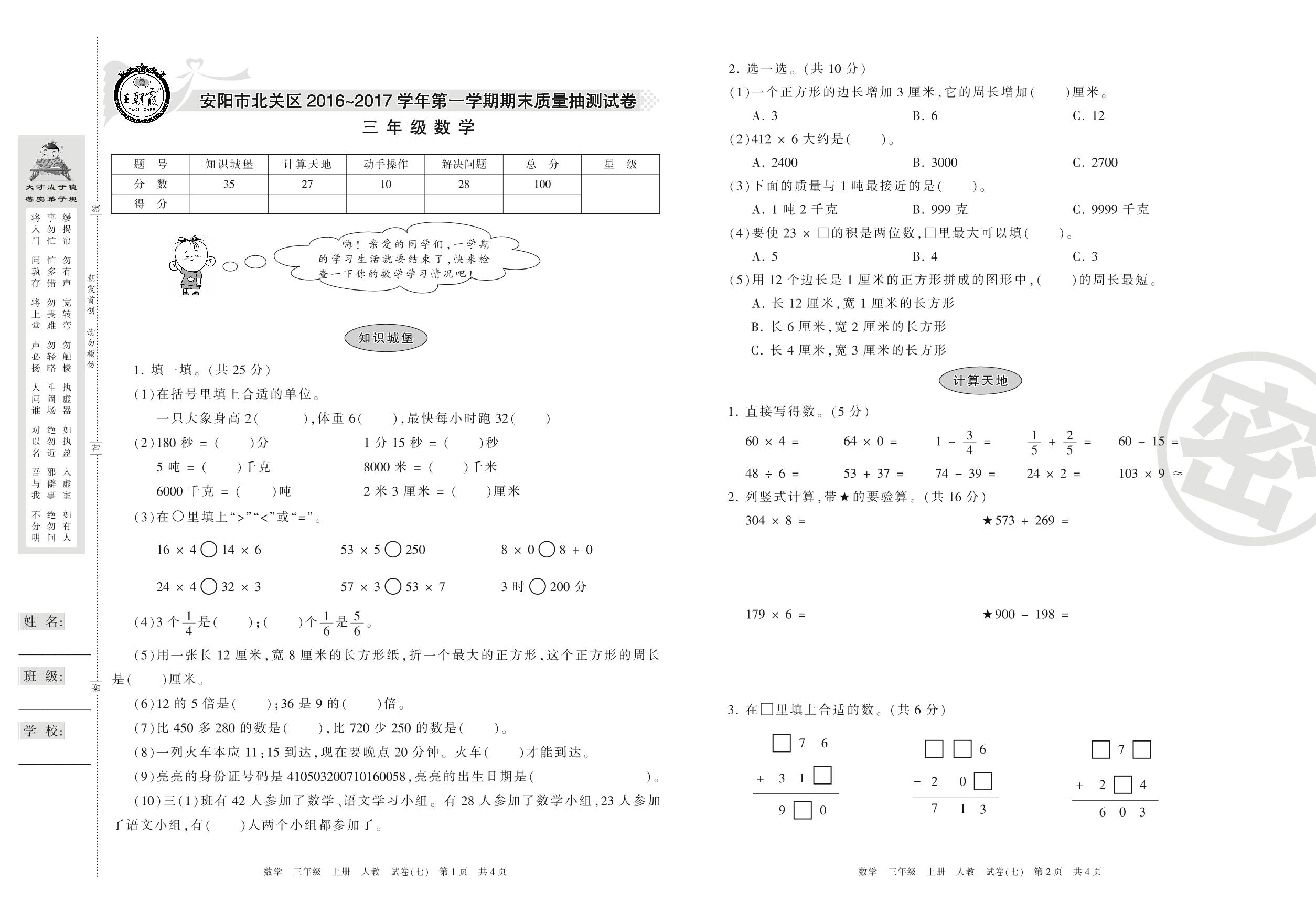 2016-2017学年第一学期安阳市北关区三年级数学试卷(人教版)【7】