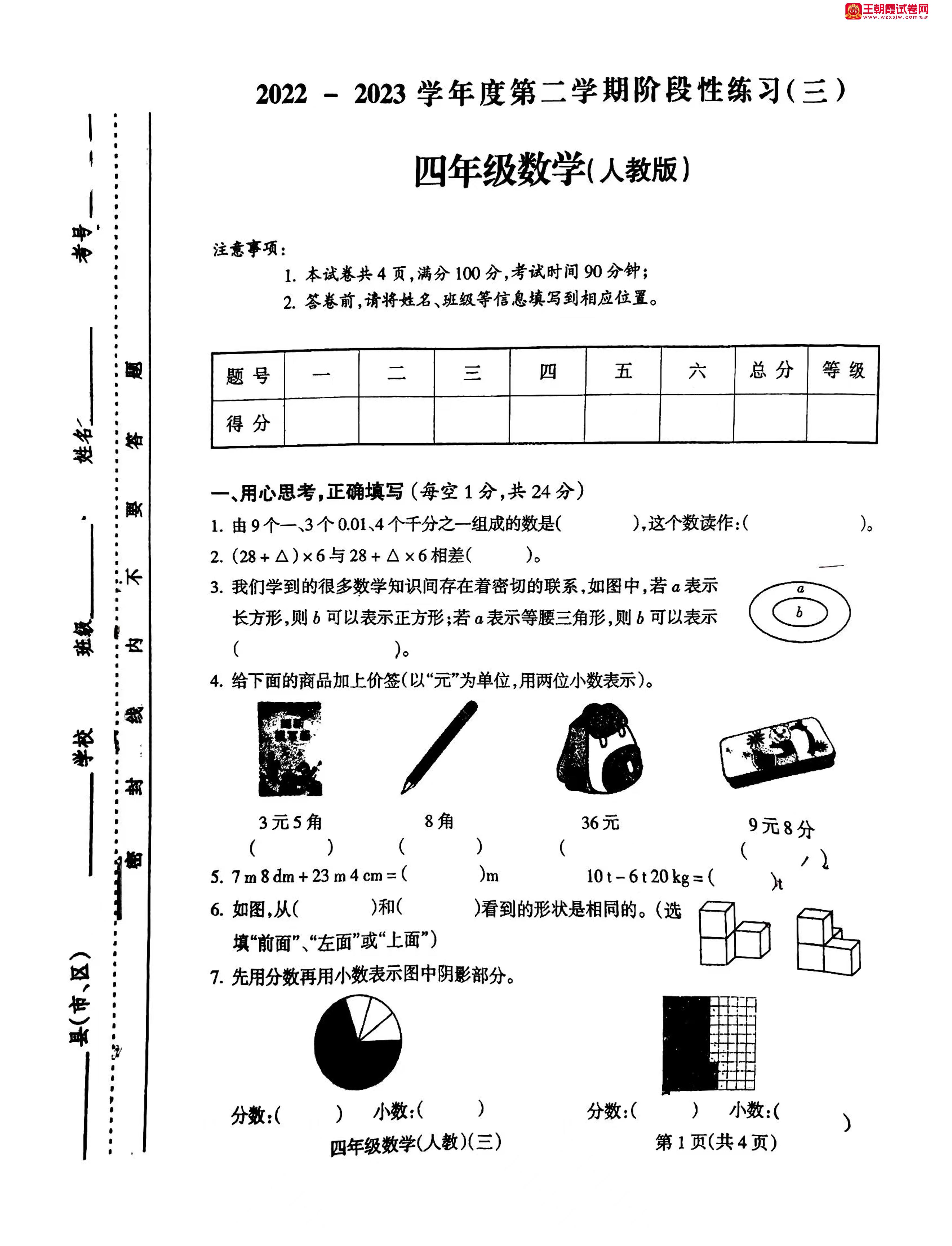 山西省朔州市怀仁市弘博小学2022-2023学年下学期阶段性练习三(月考)四年级数学(人教版)