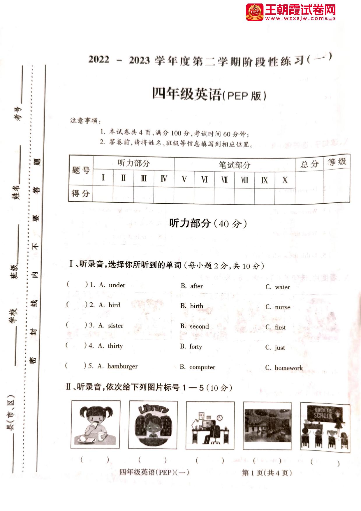 山西省吕梁市离石区光明小学2022-2023学年下学期3月月考试卷四年级英语(PEP版)【无听力音频】