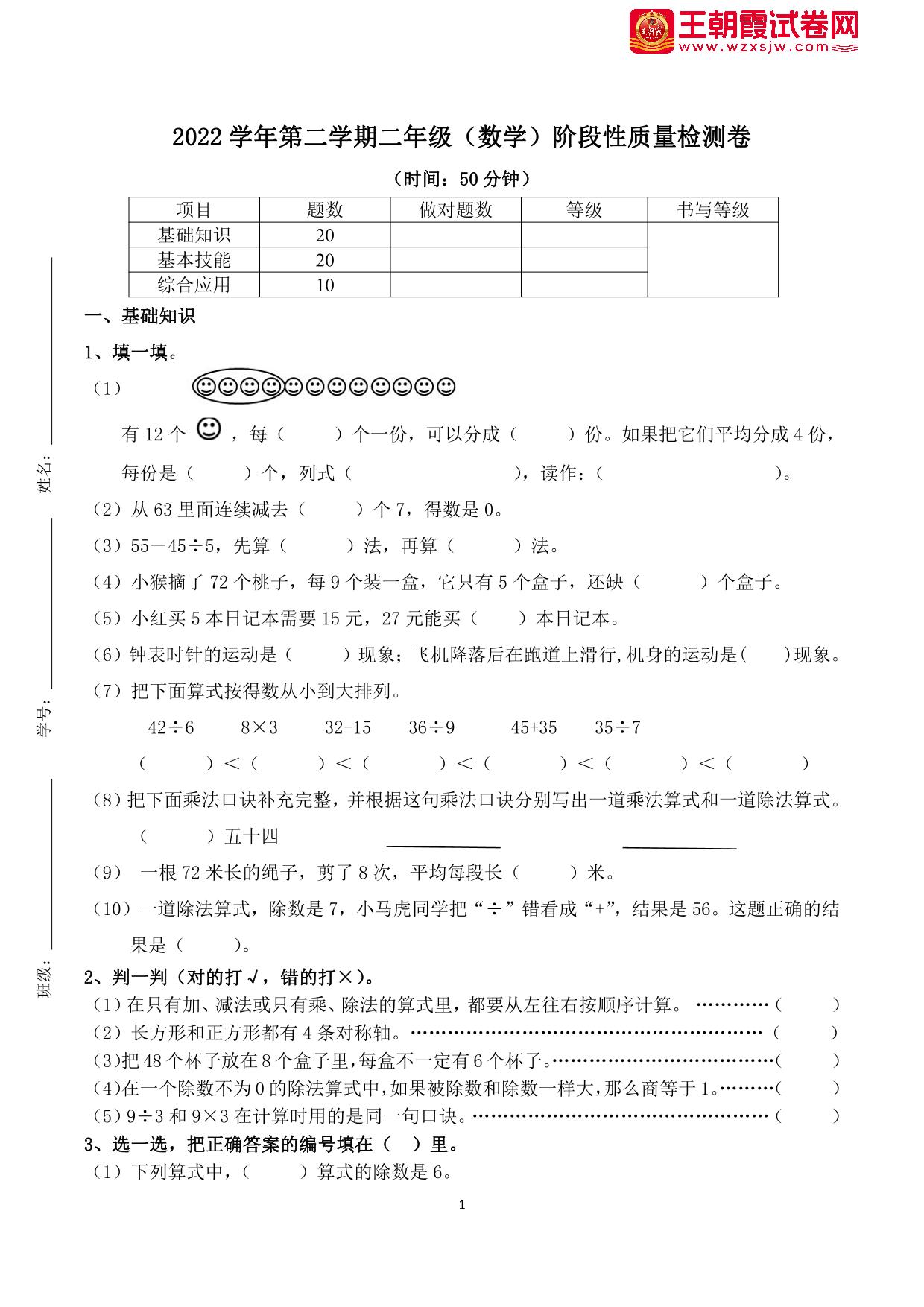 浙江省杭州市萧山区2022学年第二学期期中阶段性教学质量检测卷二年级数学(人教版)