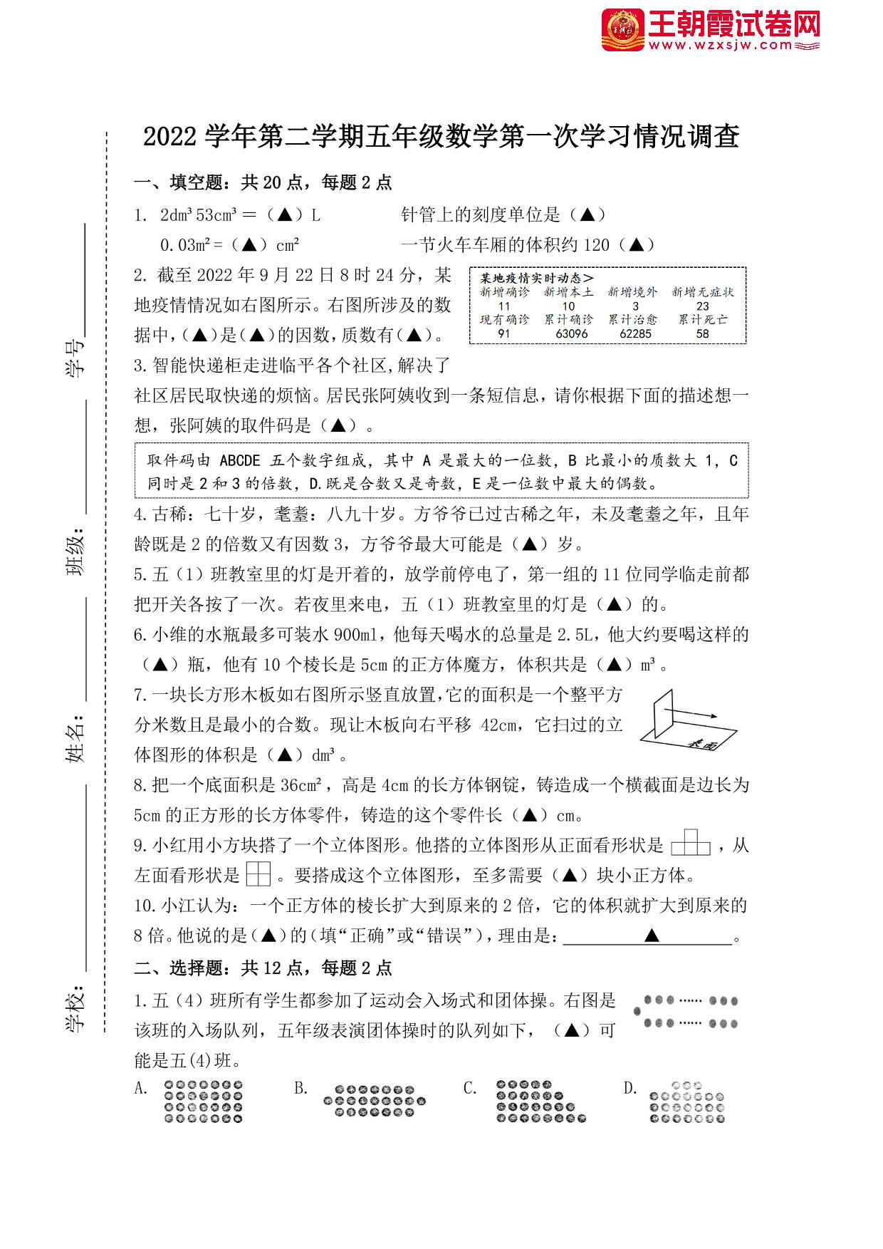 浙江省杭州市余杭区部分校2022学年下学期第一次学习情况调查(月考)五年级数学(人教版)