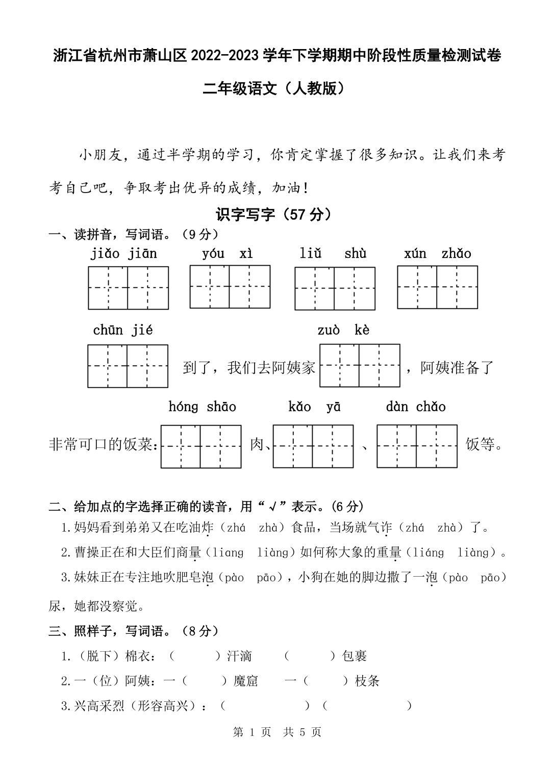 浙江省杭州市萧山区2022-2023学年下学期期中阶段性质量检测试卷二年级语文(人教版)