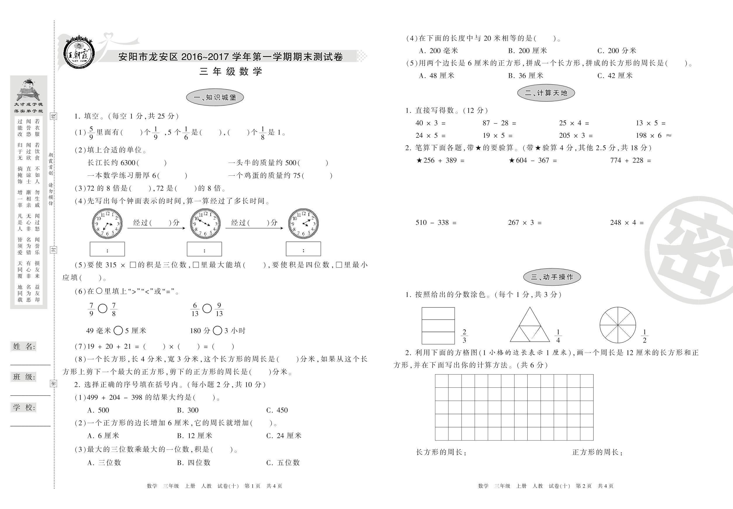2016-2017学年第一学期安阳市龙安区三年级数学试卷(人教版)【10】