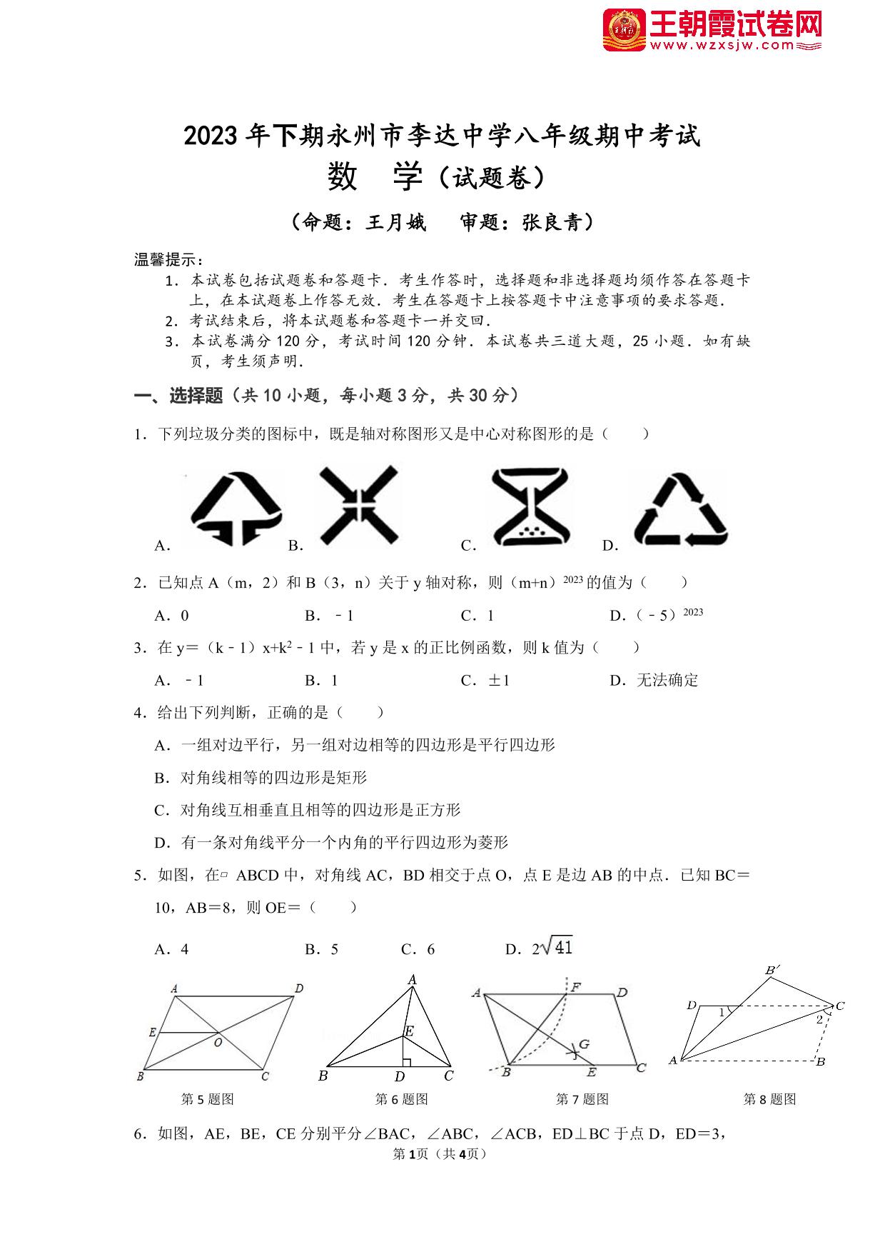 湖南省永州市李达中学2022-2023学年下学期期中考试试卷八年级数学(湘教版)