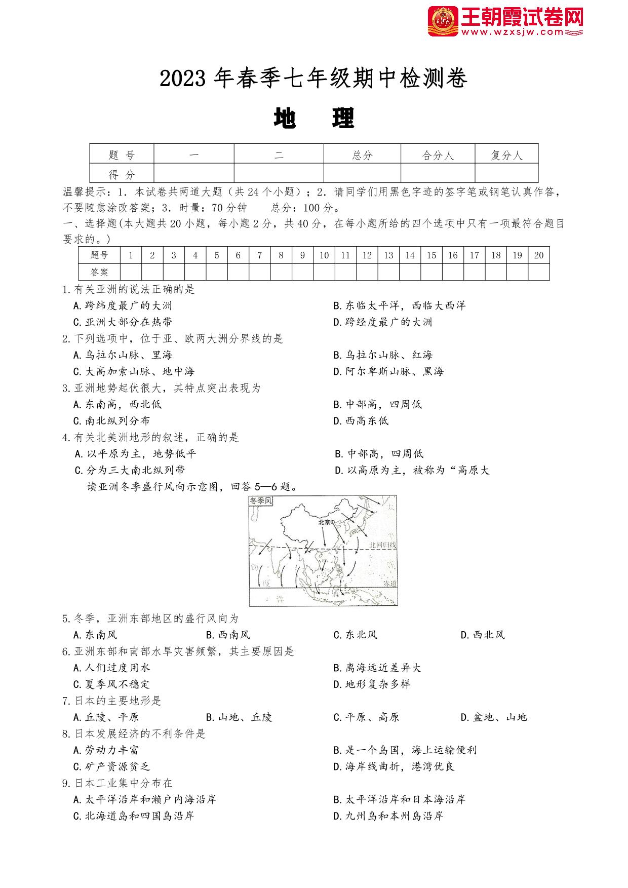 湖南省邵阳市北塔区2022-2023学年下学期期中试卷七年级地理(人教版)